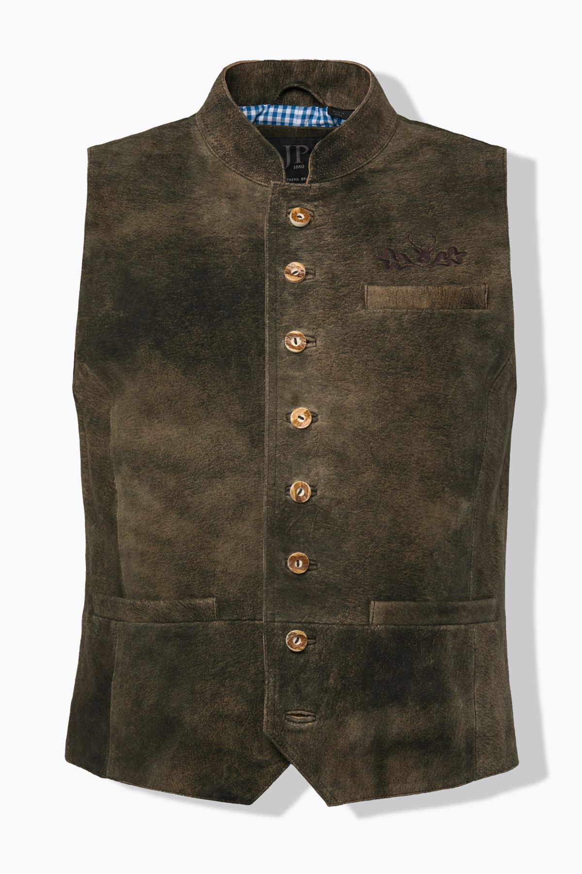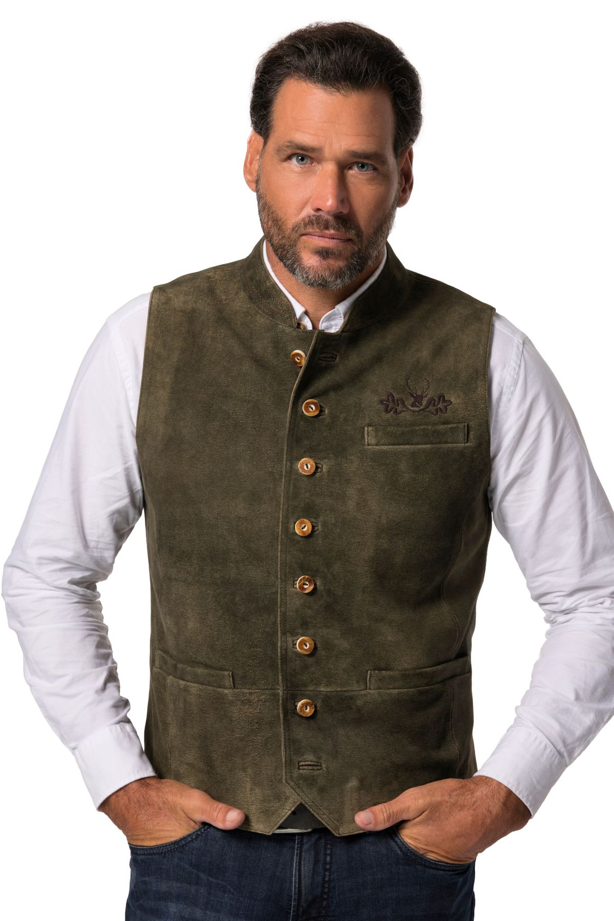 Le gilet style bavarois traditionnel dans le meilleur cuir velours de chèvre. Typique avec son col droit, ses boutons effet corne et 3 poches, la poche poitrine est brodée. Base à pointes. Doublure haut de gamme en carreaux vichy et 2 poches. Cette coupe testée vous convaincra aussi dans les grandes tailles. JP1880 - for real men only! & 10;<br>