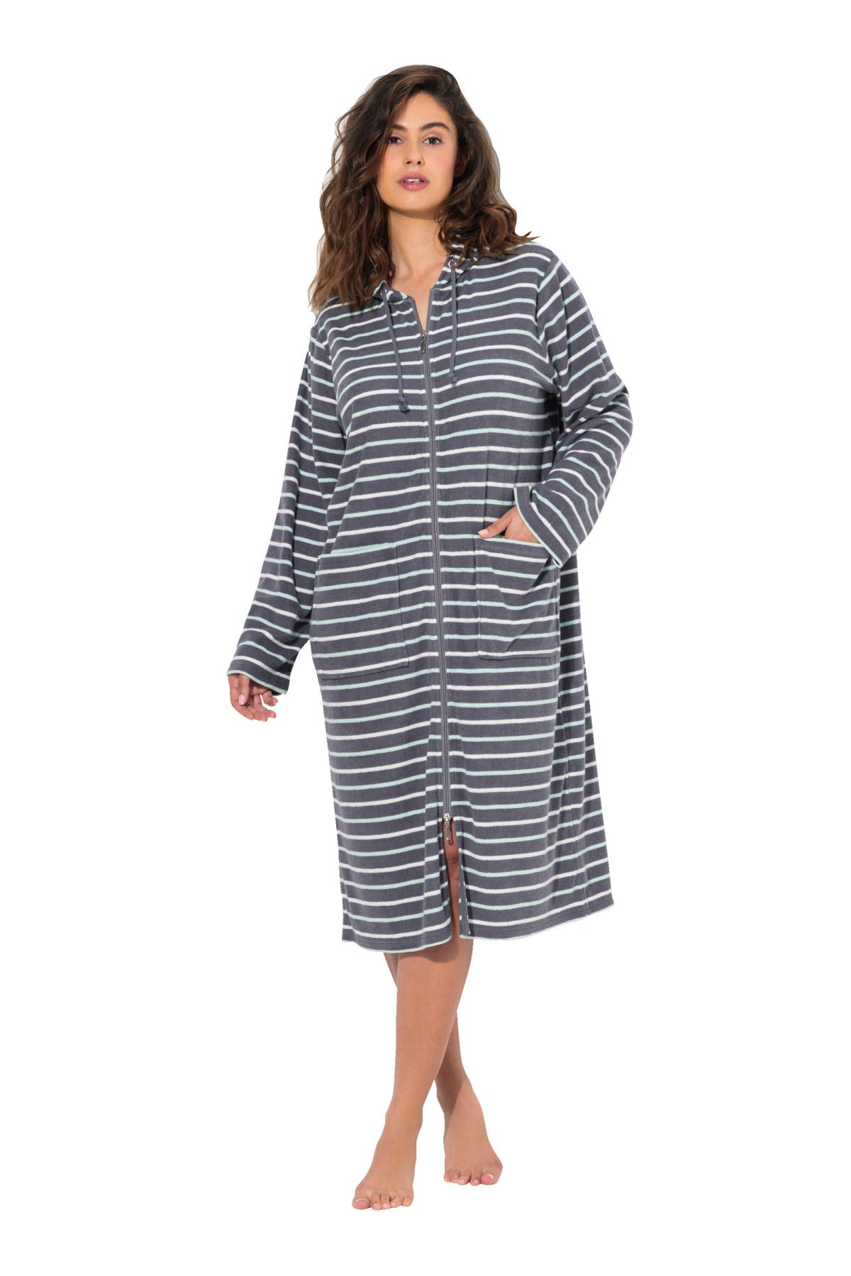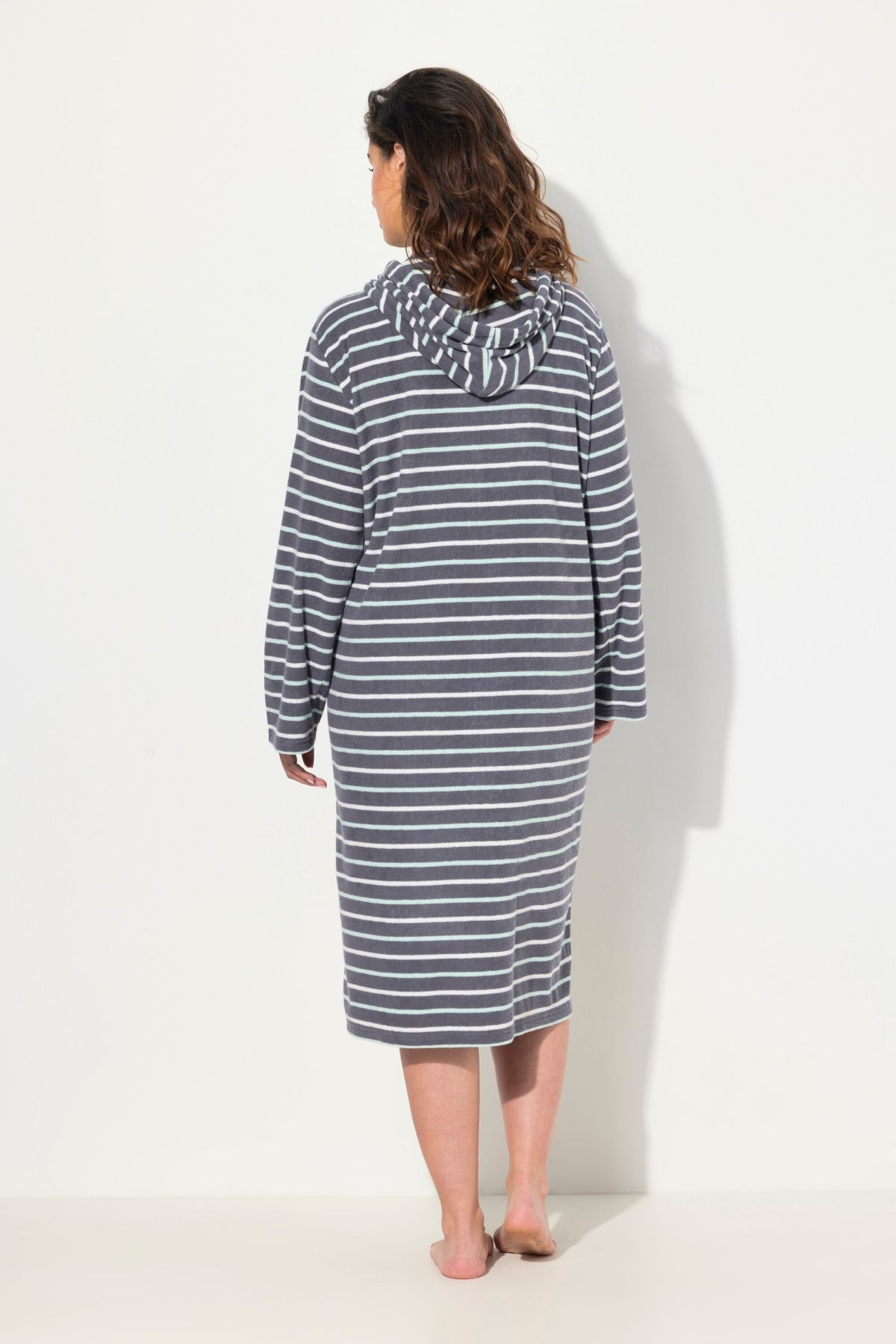 Délicat motif à rayures, Capuche à cordon, Fermeture éclair pratique à double sens, Poche kangourou et manches longues, Tissu éponge doux, Long. env. 110 cm.