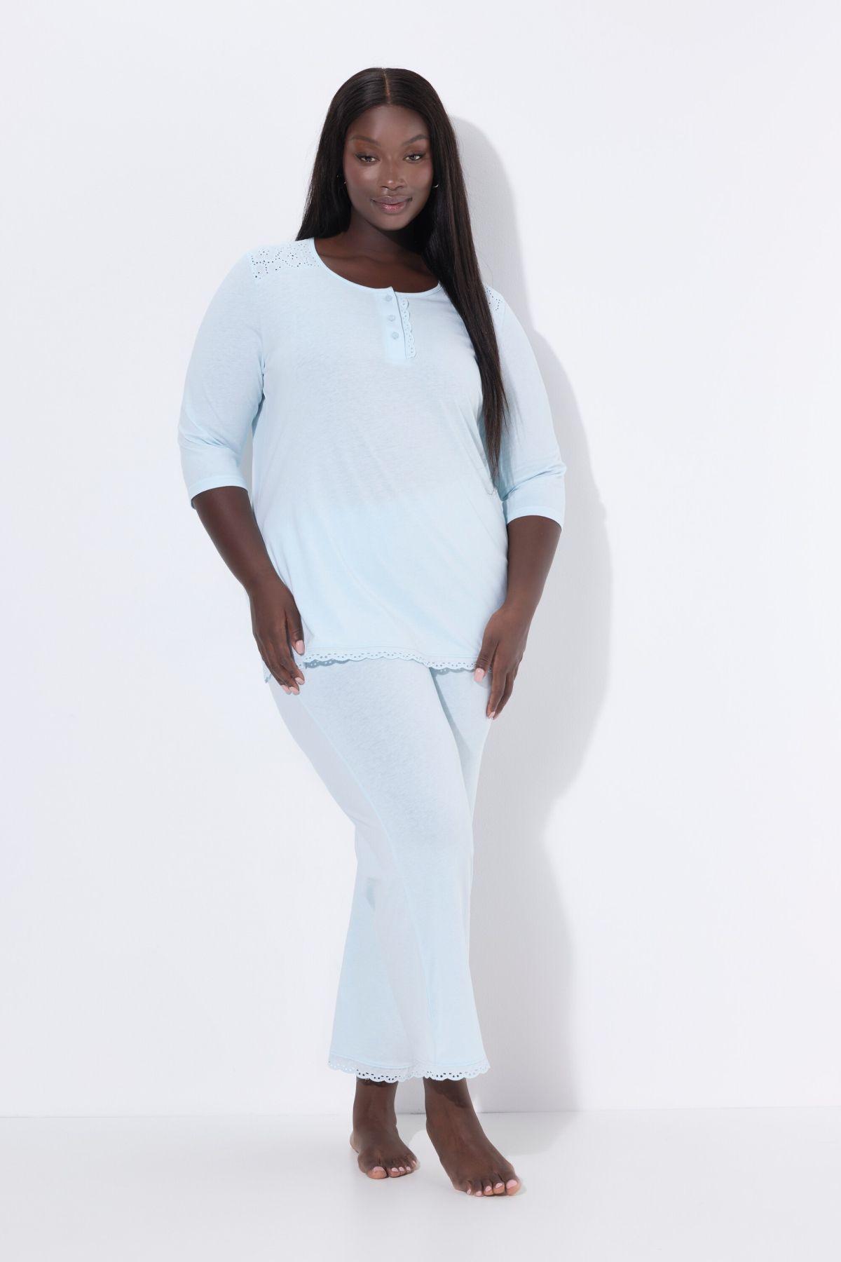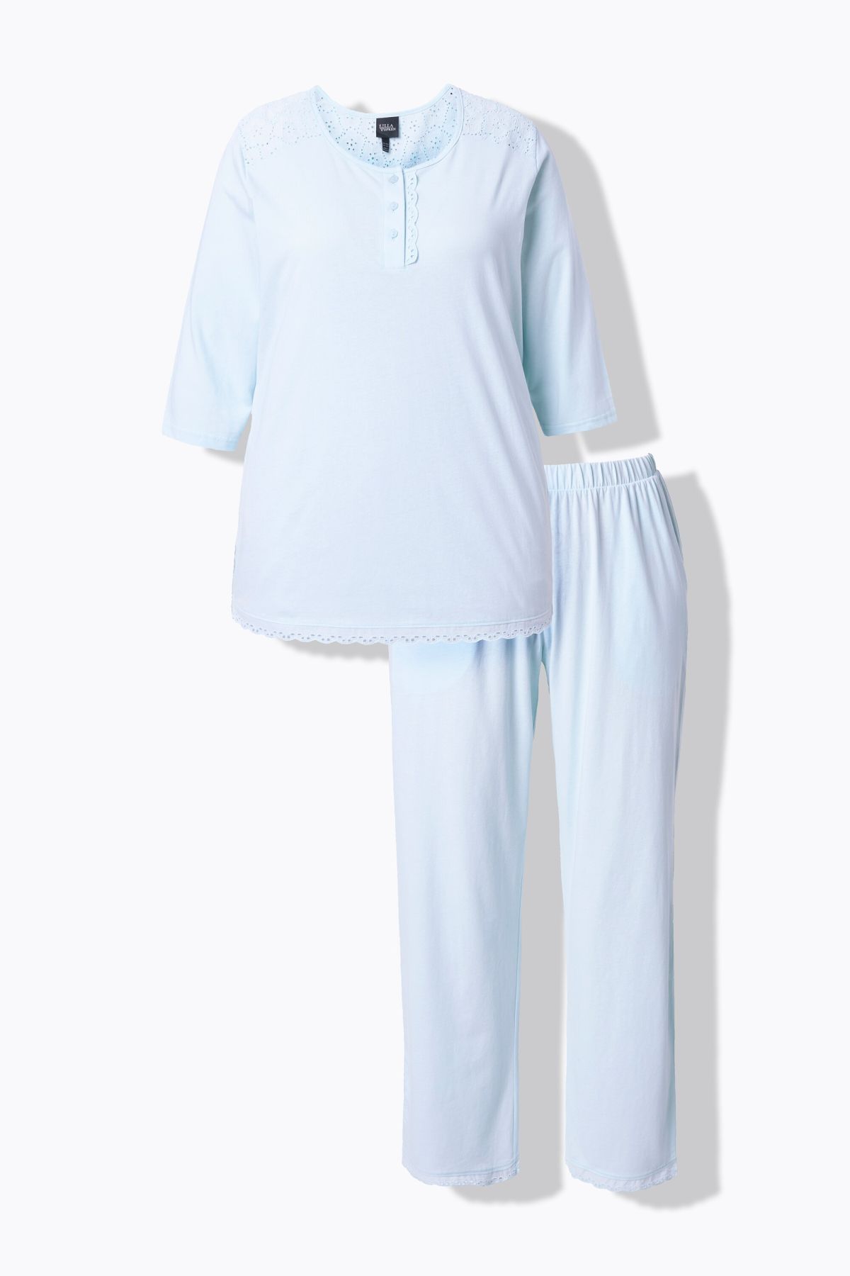 Pyjama à col rond et manches 3/4, broderie ajourée et pli décoratif