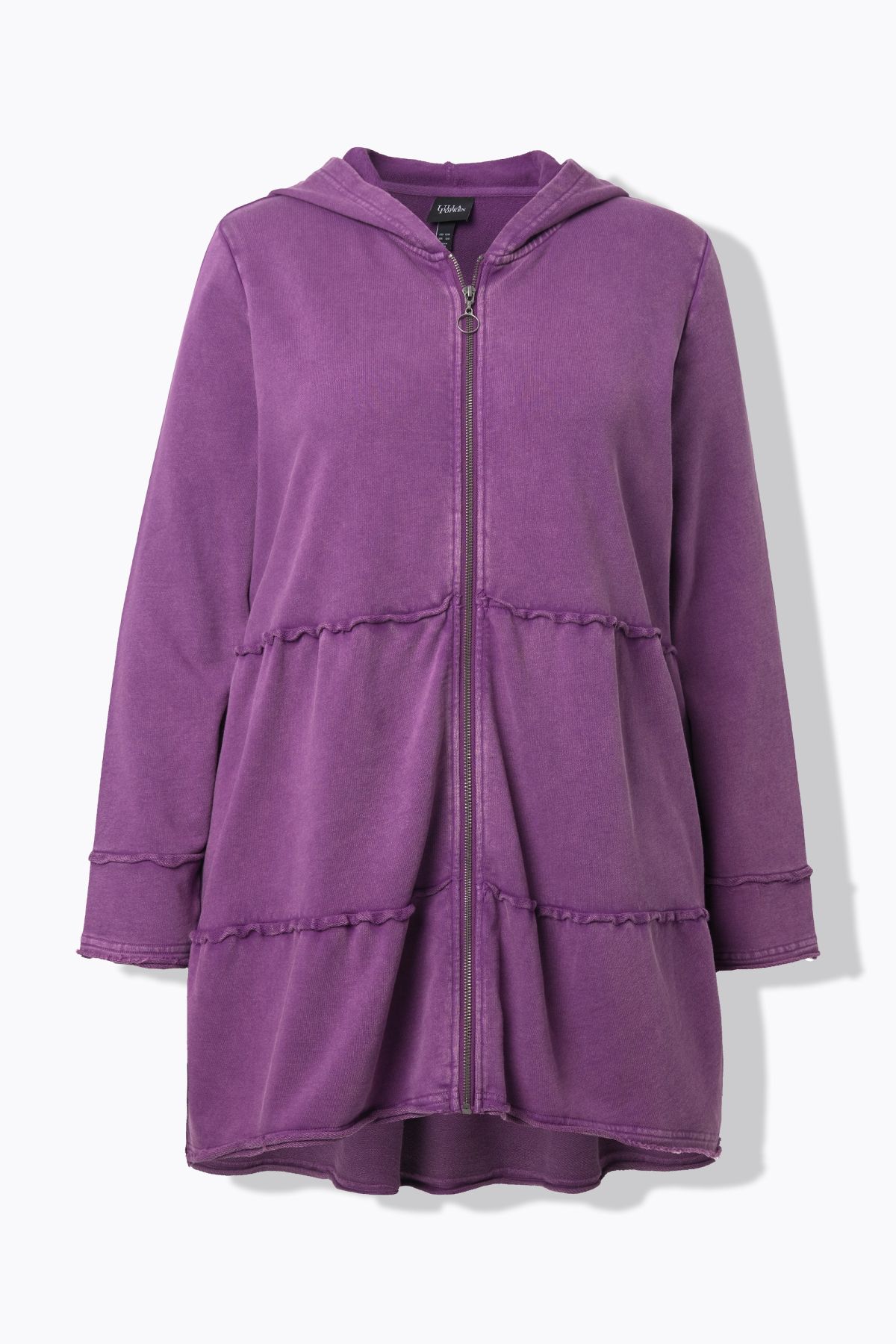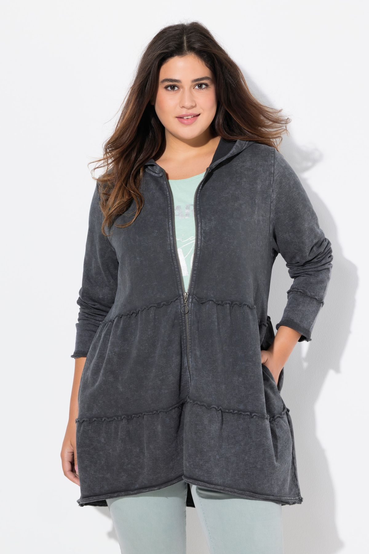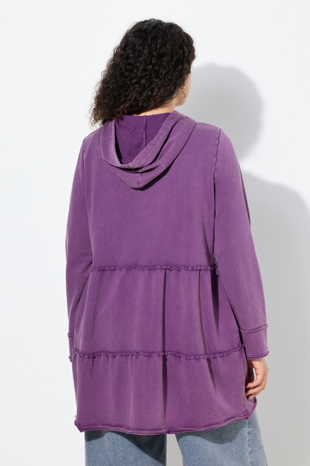 Délavage acid washed (javellisé) pour un style vintage tendance, Capuche et larges volants, Bords francs, Base arrondie, plus longue dans le dos, pur coton, Long. selon taille env. 85 cm.