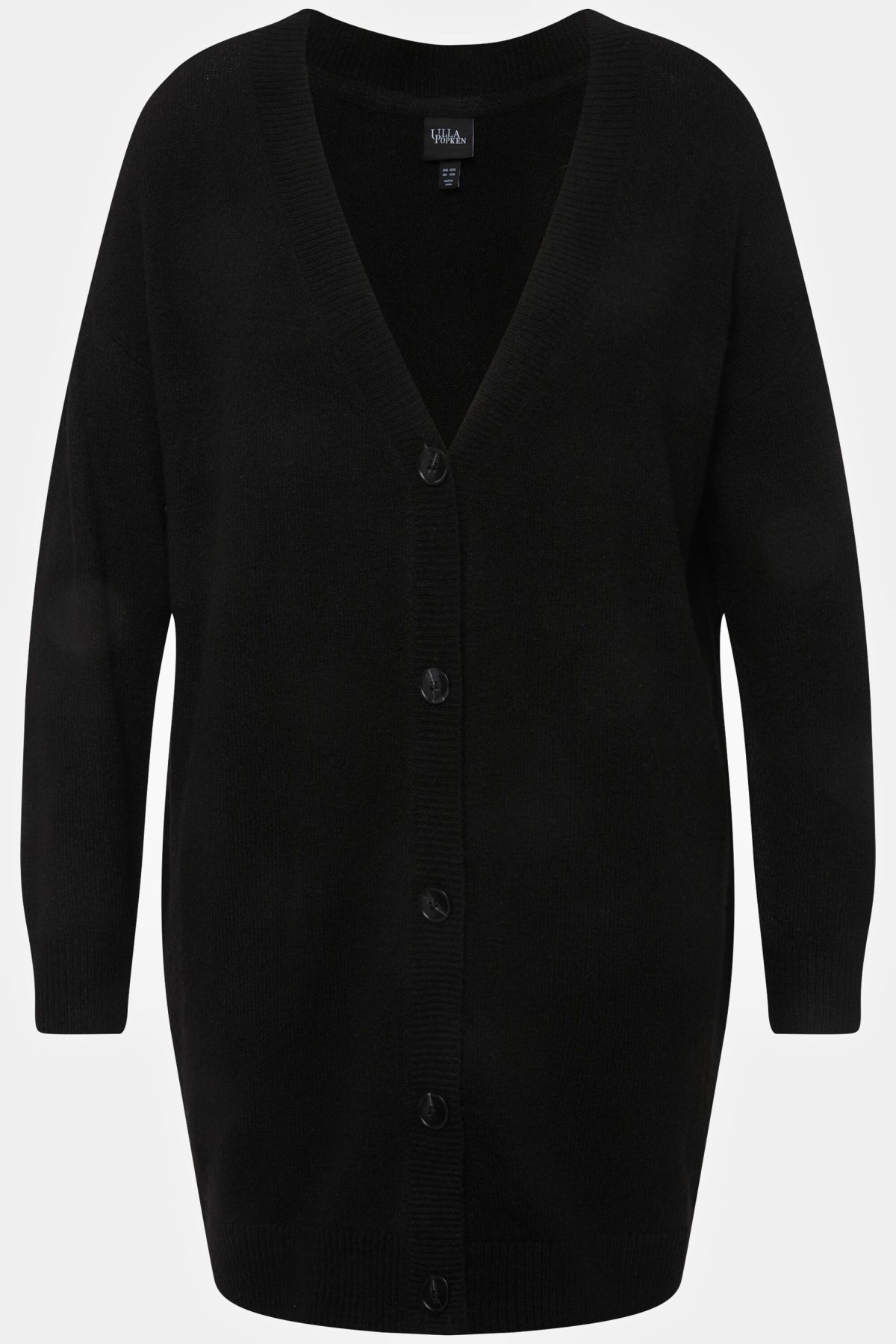 Maille fine agréablement douce et élastique, Col en V, Coupe Boxy Fit, épaules basses, Patte de boutonnage, Manches longues avec finitions bords-côtes, Long. entrej. env. 85