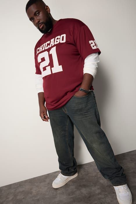 Taille L - 8 XL, Grand imprimé esprit football américain, Coupe oversize extra-large, tissu mesh, Col en V, Notre mannequin mesure 1,90 m et porte du 3 XL, Long. selon taille env. 76-88 cm.