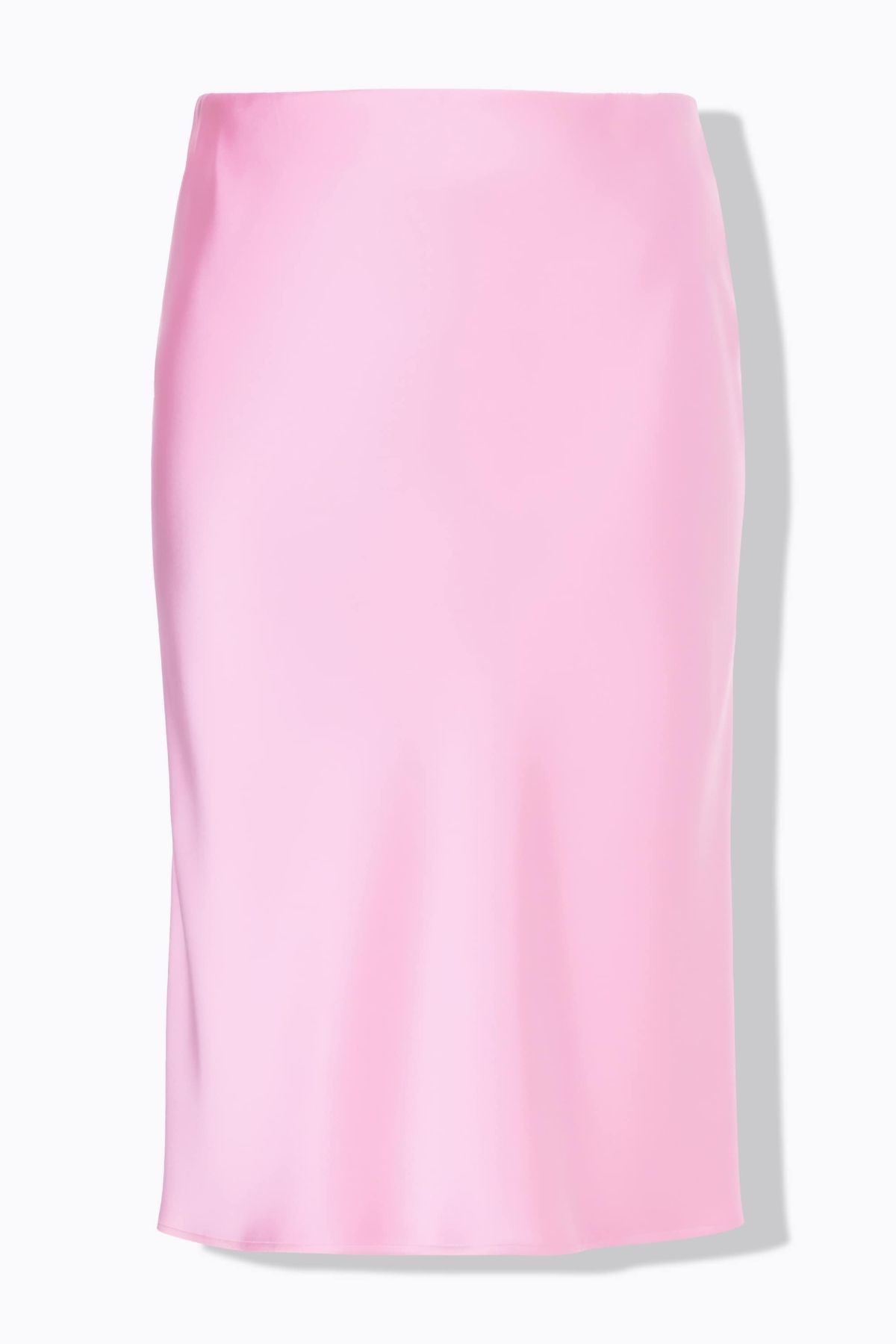 leichte A-Line, schimmernder Satin, unsichtbarer Elastikbund innen, nahtfeiner Seitenzipper, Länge ca. 78 cm.