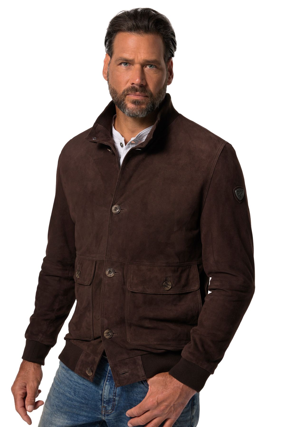 Coupe spéciale jusqu'au 7 XL, Véritable cuir suédé de chèvre, souple et confortable, Col montant, Poignets élastiques, Grandes poches à double entrée, Long. selon taille env. 70-80 cm.