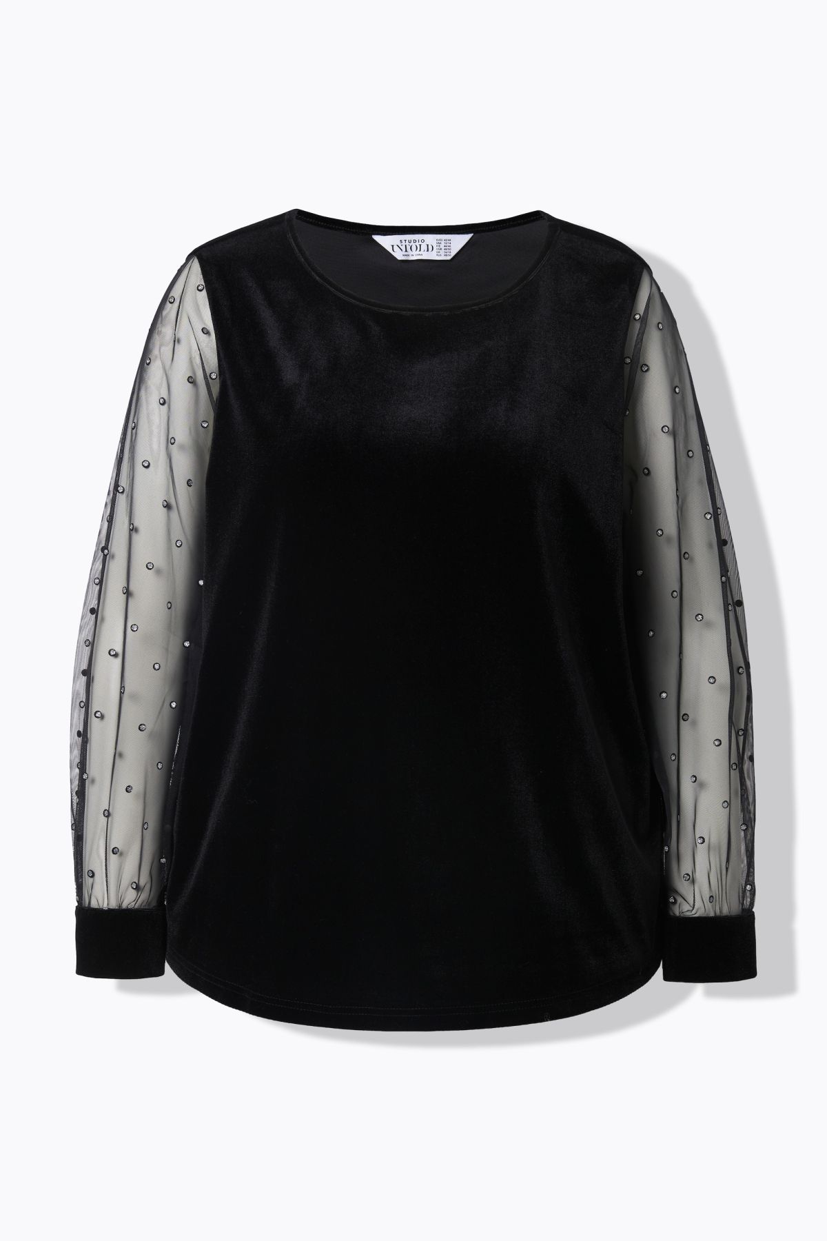 Wide Straight Shape, aus weichem Samt, Ballonärmeln aus Glitter-Mesh, Rundhalsausschnitt, Samt-Manschetten, Größenangepasste Länge ca. 65-73 cm.