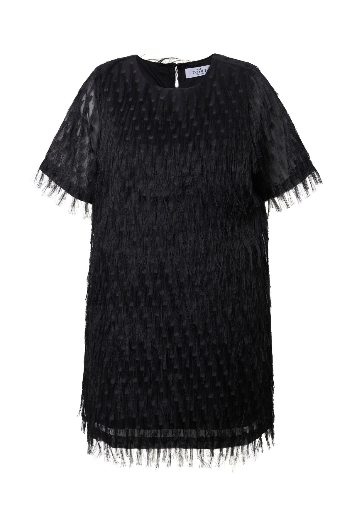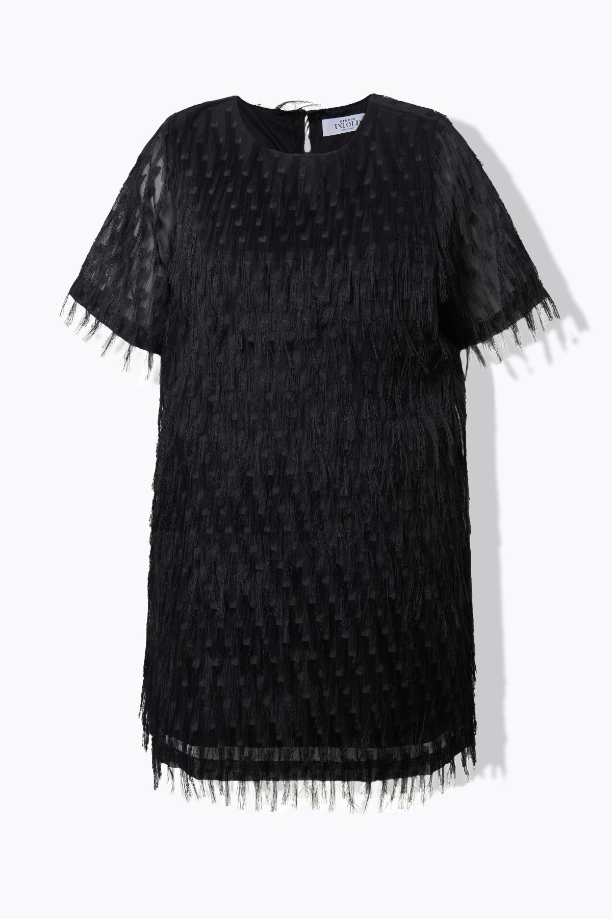 Straight Loose Shape, allover Fransen, Rundhalsausschnitt, Halbarm, elastisches Futter, Größenangepasste Länge ca. 92-96 cm.