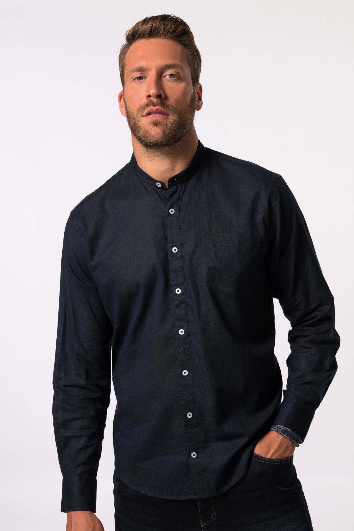 Chemise en lin, manches longues, col droit et poche poitrine. La coupe JP1880 Modern Fit étant un peu plus étroite, la chemise peut se porter aussi sur le pantalon. Pour un confort optimal, les boutons sont plus grands à partir du 4XL. JP1880 - for real men only !& 10;<br>