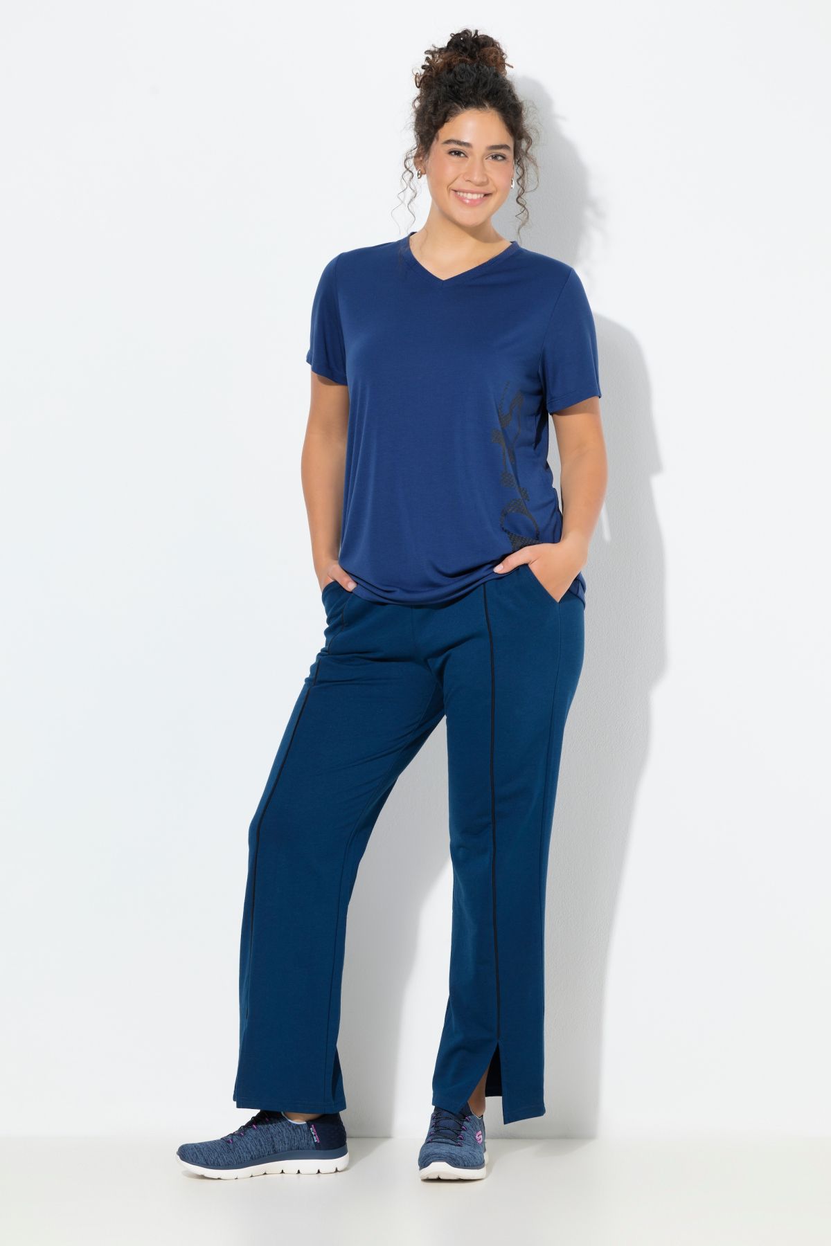 farbige Paspeln, gerades Bein, vorne mit Saumschlitz, bequemer Elastikbund mit Band, seitliche Einschubtaschen, Schrittlänge ca. 78 cm.