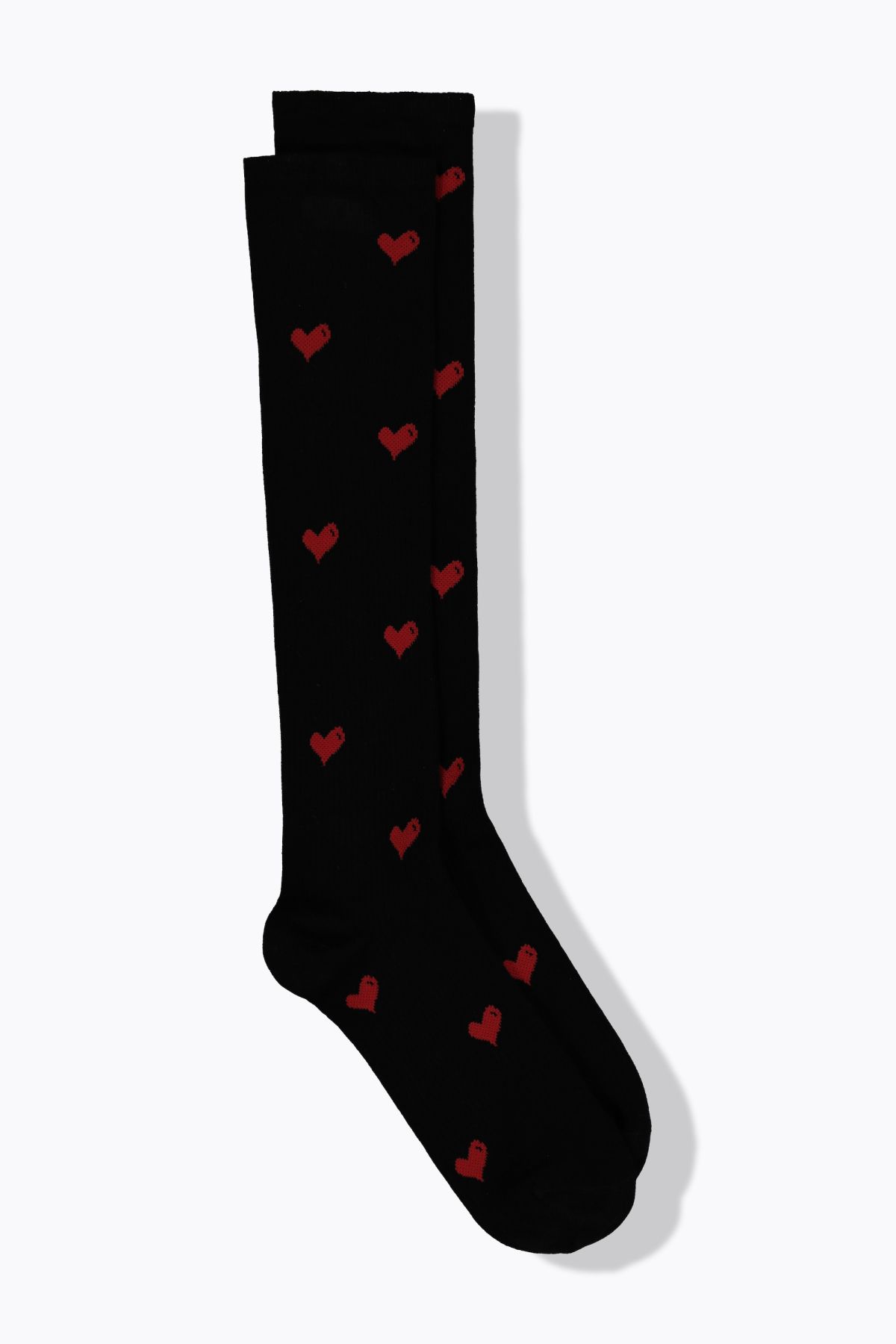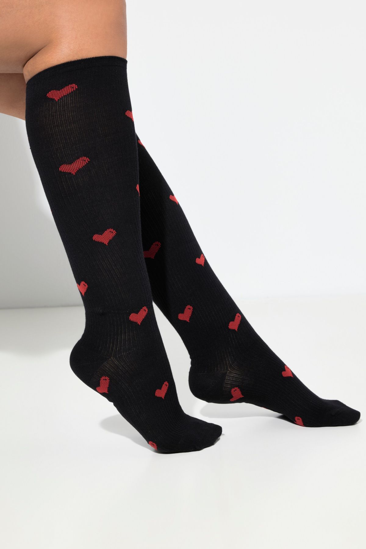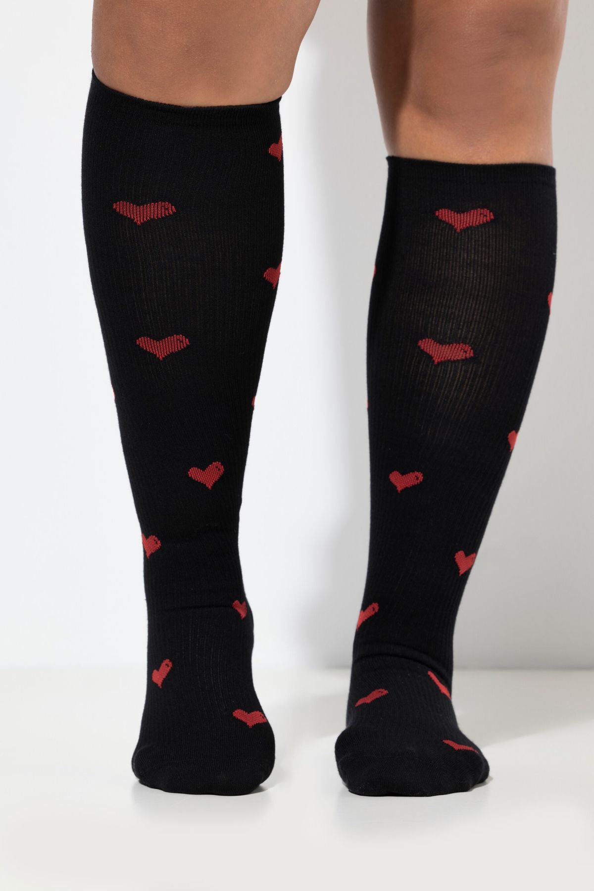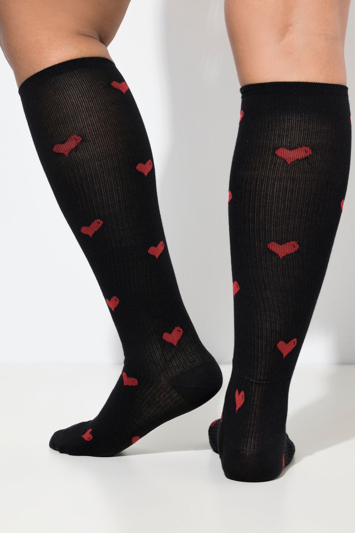 Kompressions-Kniestrumpf mit roten Herzen. Egal ob beim Schlangestehen, im Zug oder am Schreibtisch – diese Stützkniestrümpfe sind ideal bei langem Stehen und Sitzen.
