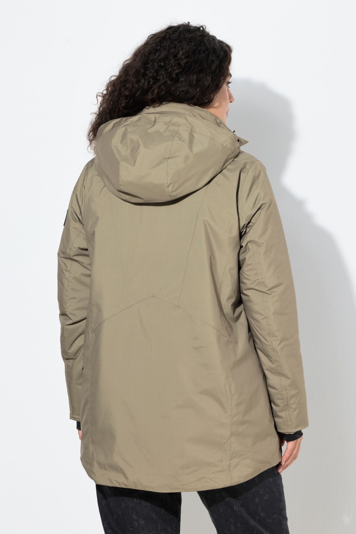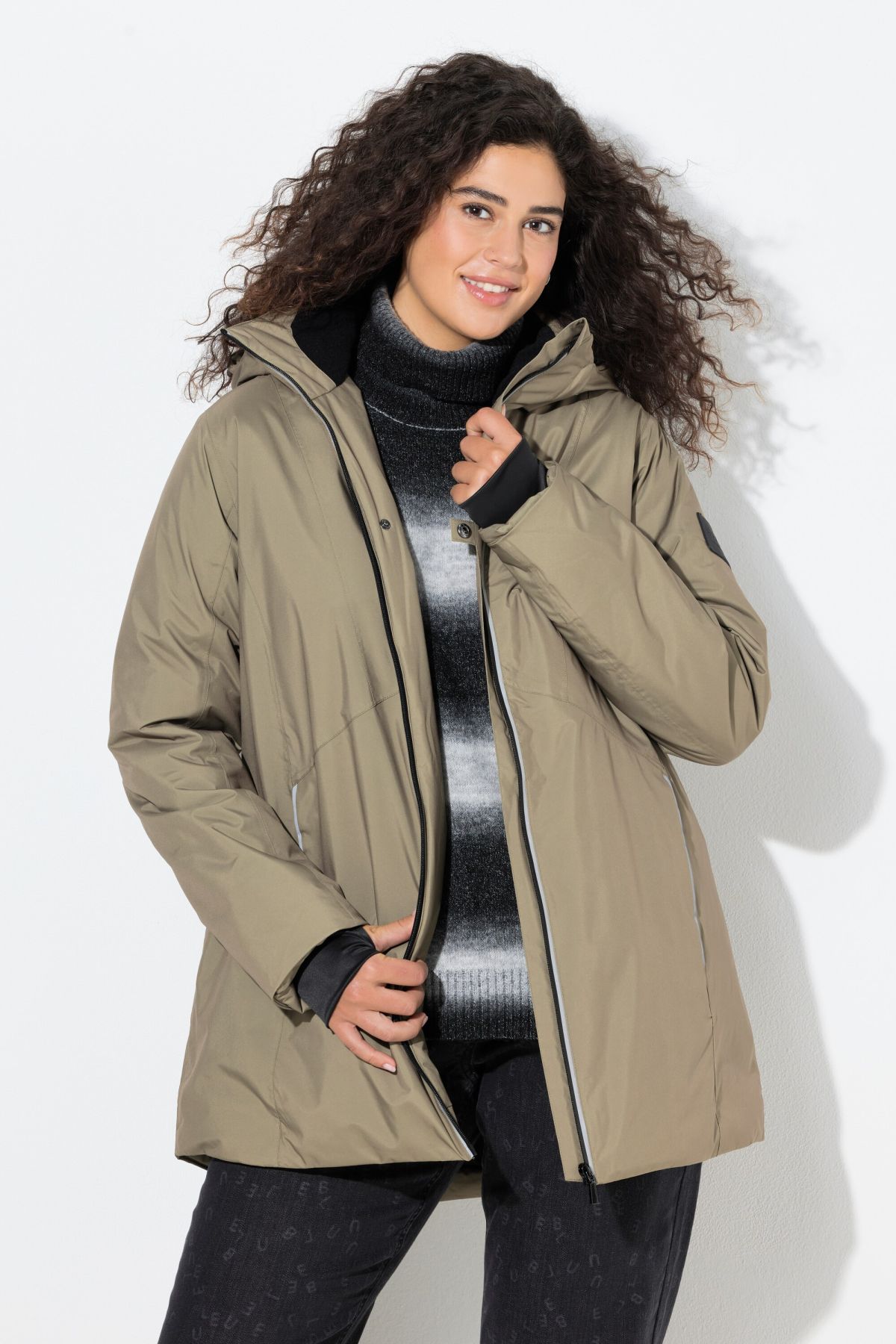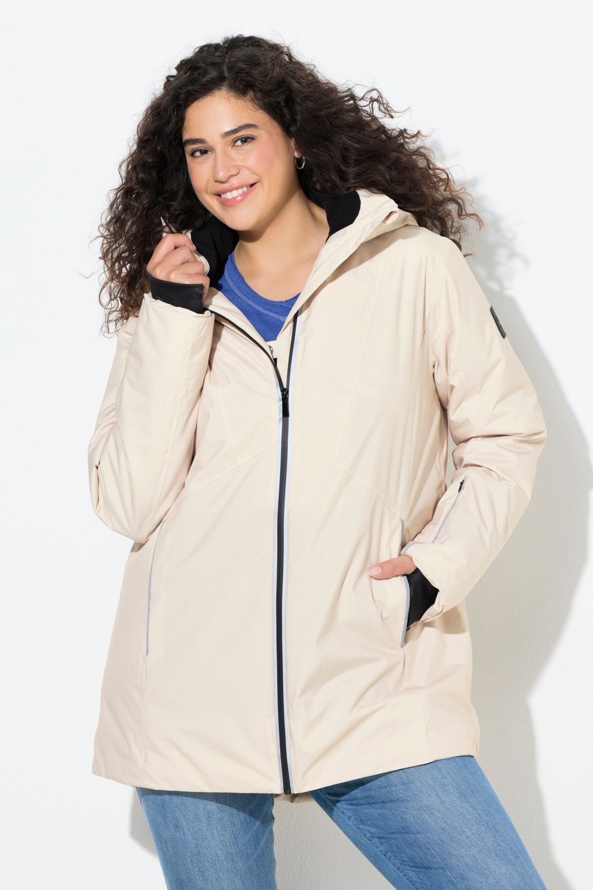 Funktions-Kapuzenjacke, etwas längere A-Linie, mit Membran-Vorteilen: wasserdicht (10.000 mm Wassersäule), winddicht, atmungsaktiv. Alle Nähte zusätzlich versiegelt. Modische Reflektordetails für verbesserte Sichtbarkeit. Verstellbare und abnehmbare Kapuze, Stehkragen innen mit weichem Fleece. Wasserdichter Reißverschluss, 2 verdeckte Reißverschlusstaschen mit wärmendem Fleecefutter. Komplettfutter mit 2 Taschen.