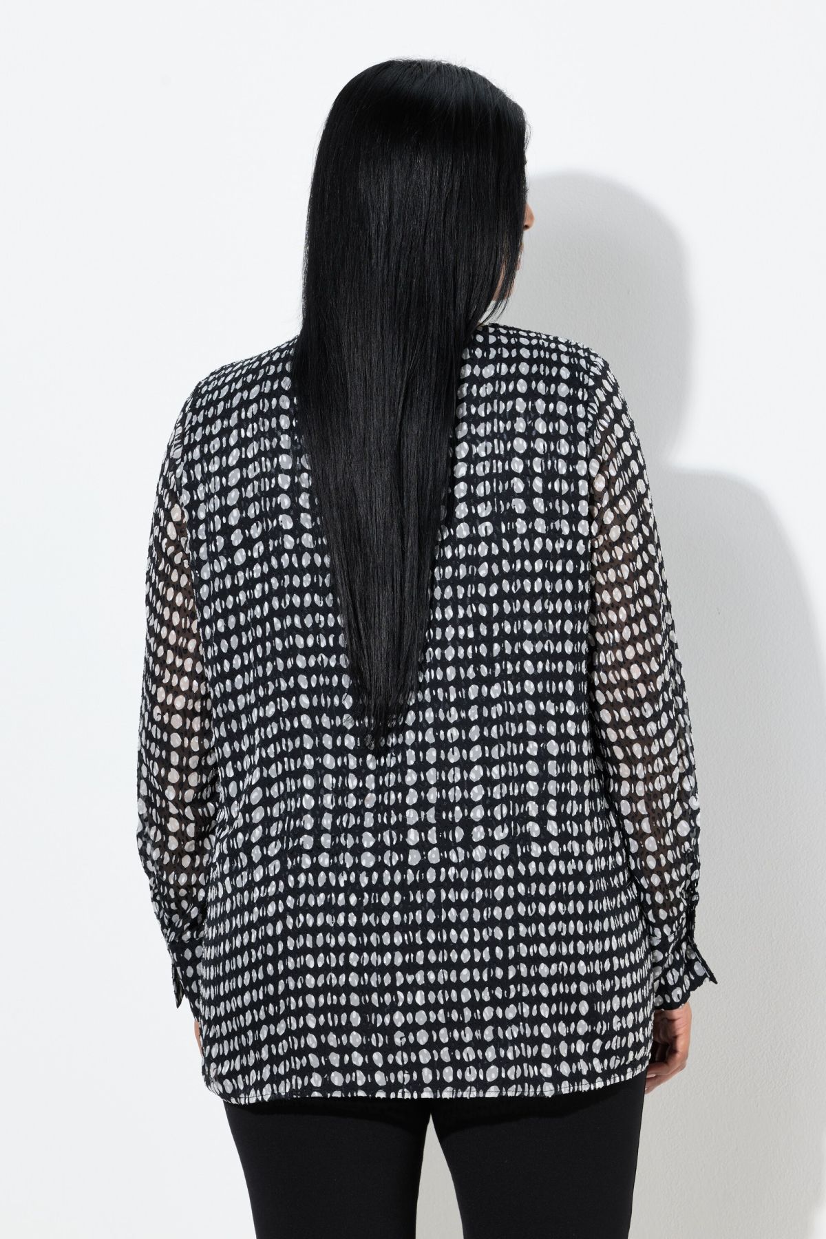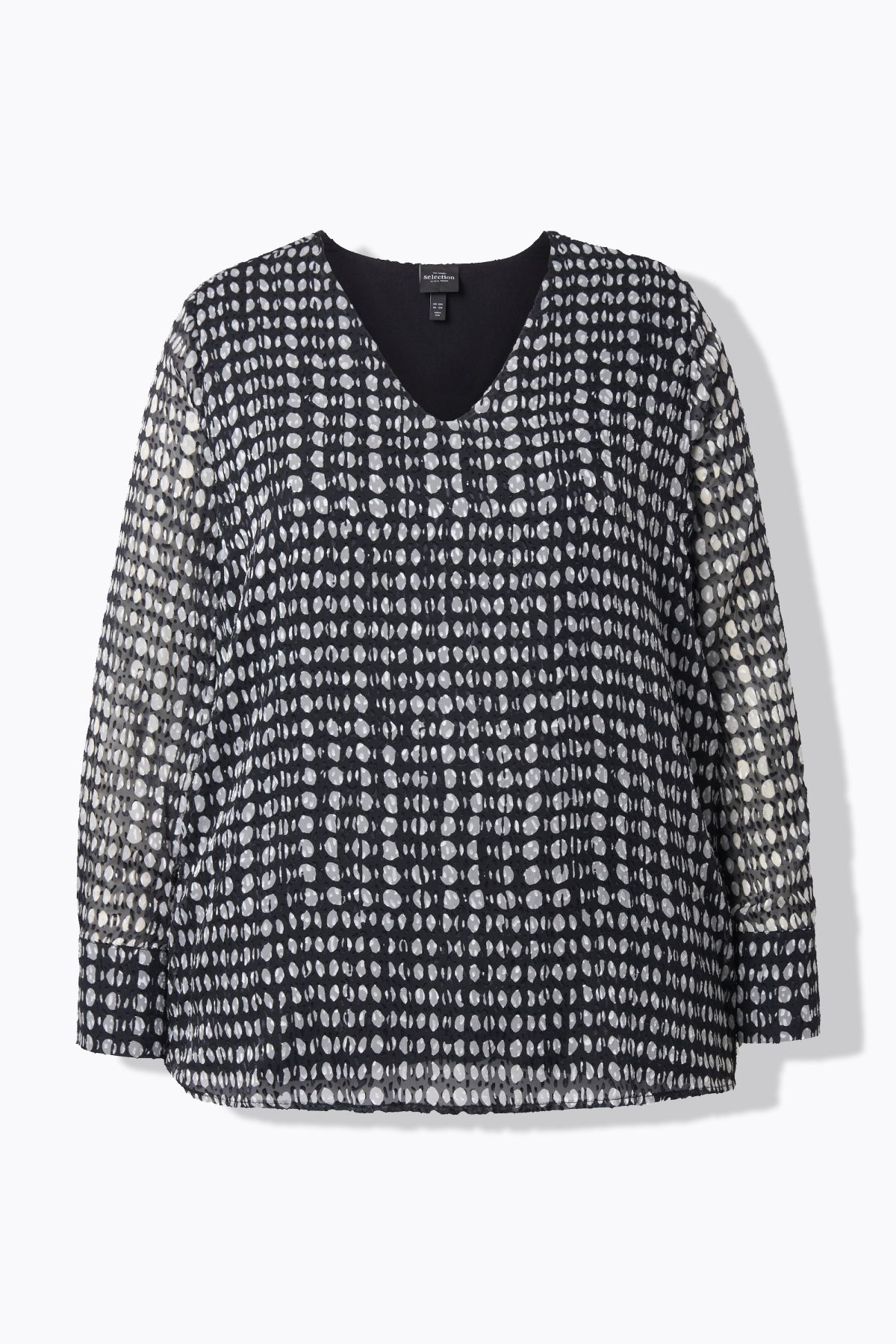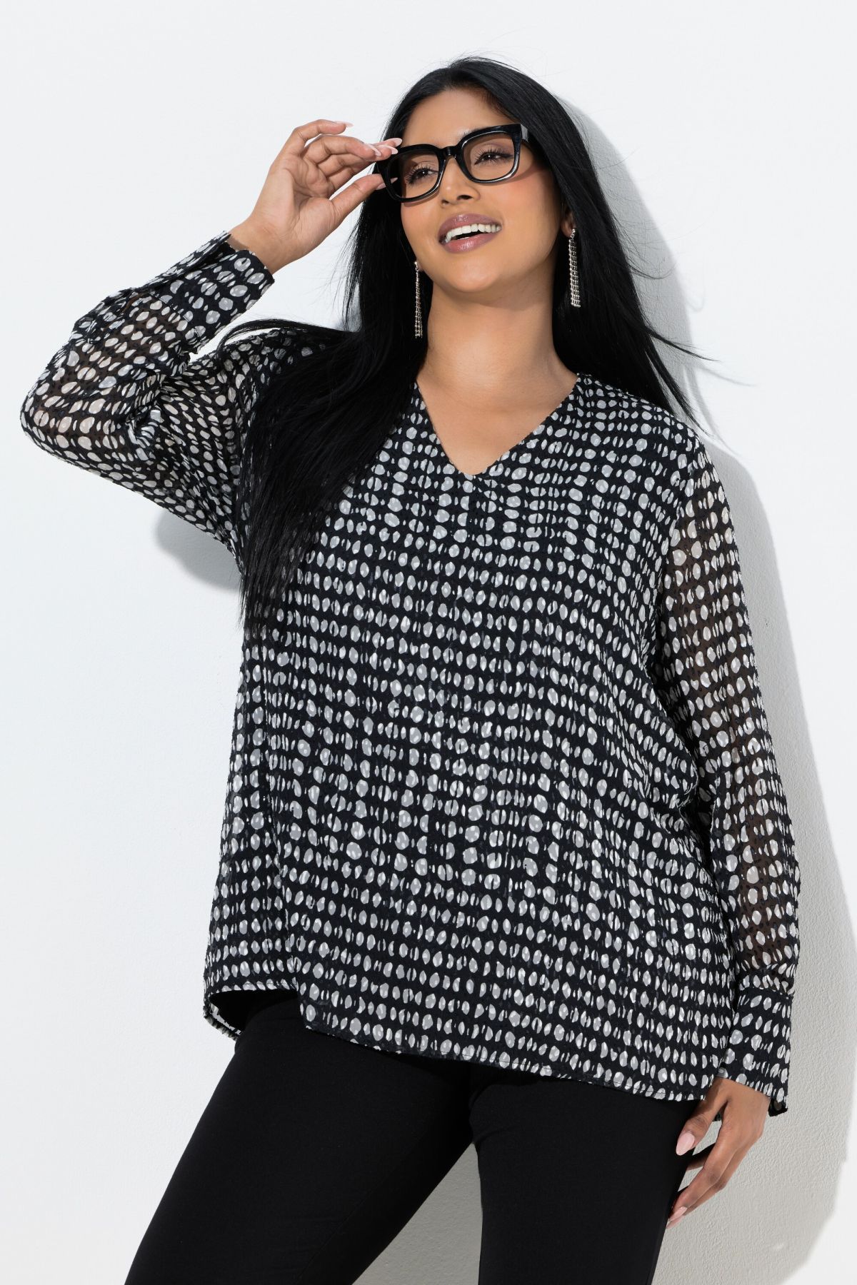 Bluse, A-Linie, aus leicht transparentem Chiffon-Jacquard. Darunter blickdichtes Jerseytop. V-Ausschnitt, transparenter Langarm mit Manschetten. & 10;<br> & 10;<br>Premium-Mode für Dich! & 10;<br>selection by Ulla Popken steht für Qualität und tragbare Eleganz. Klassiker verwandelt selection by Ulla Popken in moderne Highlights aus hochwertigen Materialien mit aufwendigen Drucken und Details – perfekt für jeden Tag und besondere Anlässe! & 10;<br>& 10;<br>& 10;