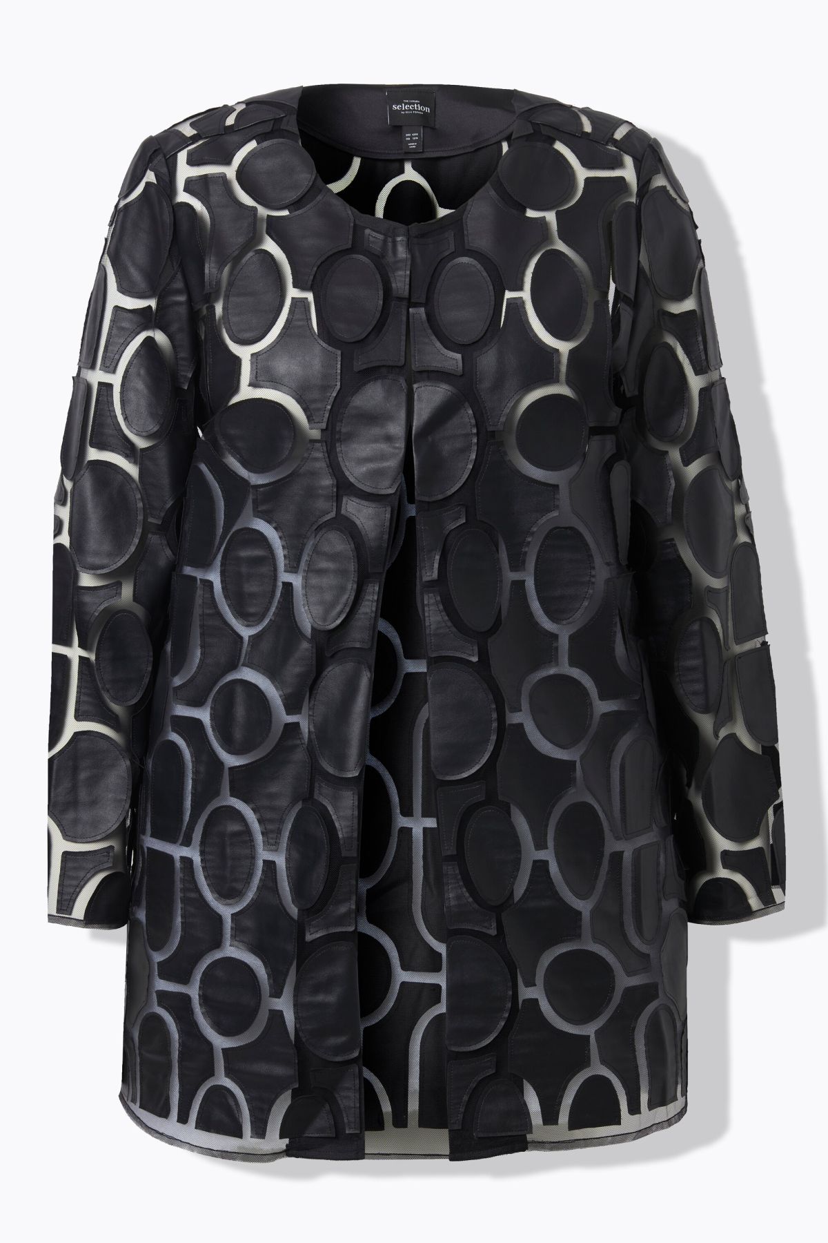 Lederoptik-Jacke, längere A-Linie, aus transparentem Mesh mit weicher Lederoptik im grafischen Patch-Design. Rundhalsausschnitt mit dezentem Hakenverschluss. Langarm.& 10;<br> & 10;<br>Premium-Mode für Dich! & 10;<br>selection by Ulla Popken steht für Qualität und tragbare Eleganz. Klassiker verwandelt selection by Ulla Popken in moderne Highlights aus hochwertigen Materialien mit aufwendigen Drucken und Details – perfekt für jeden Tag und besondere Anlässe! & 10;<br>& 10;<br>& 10;