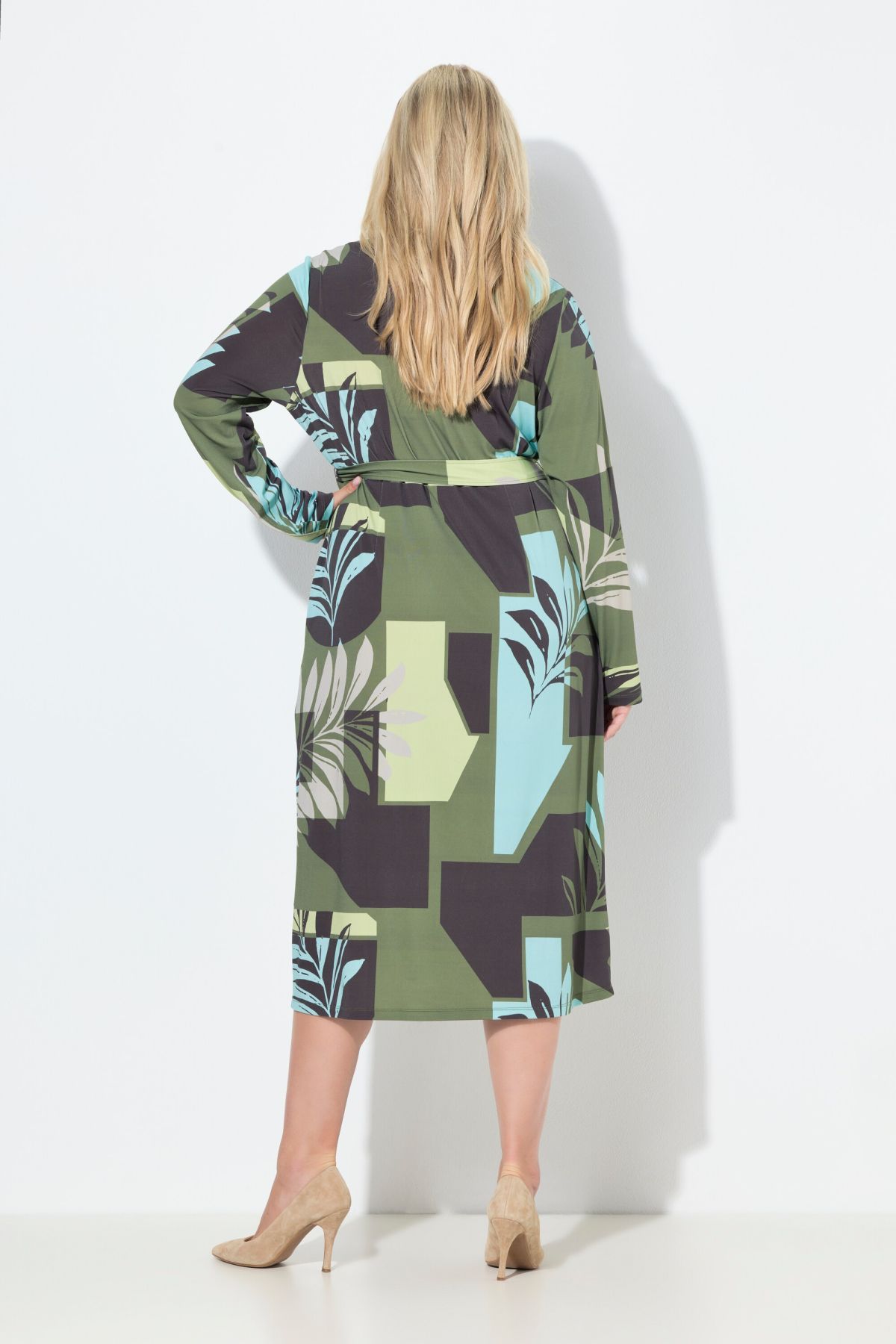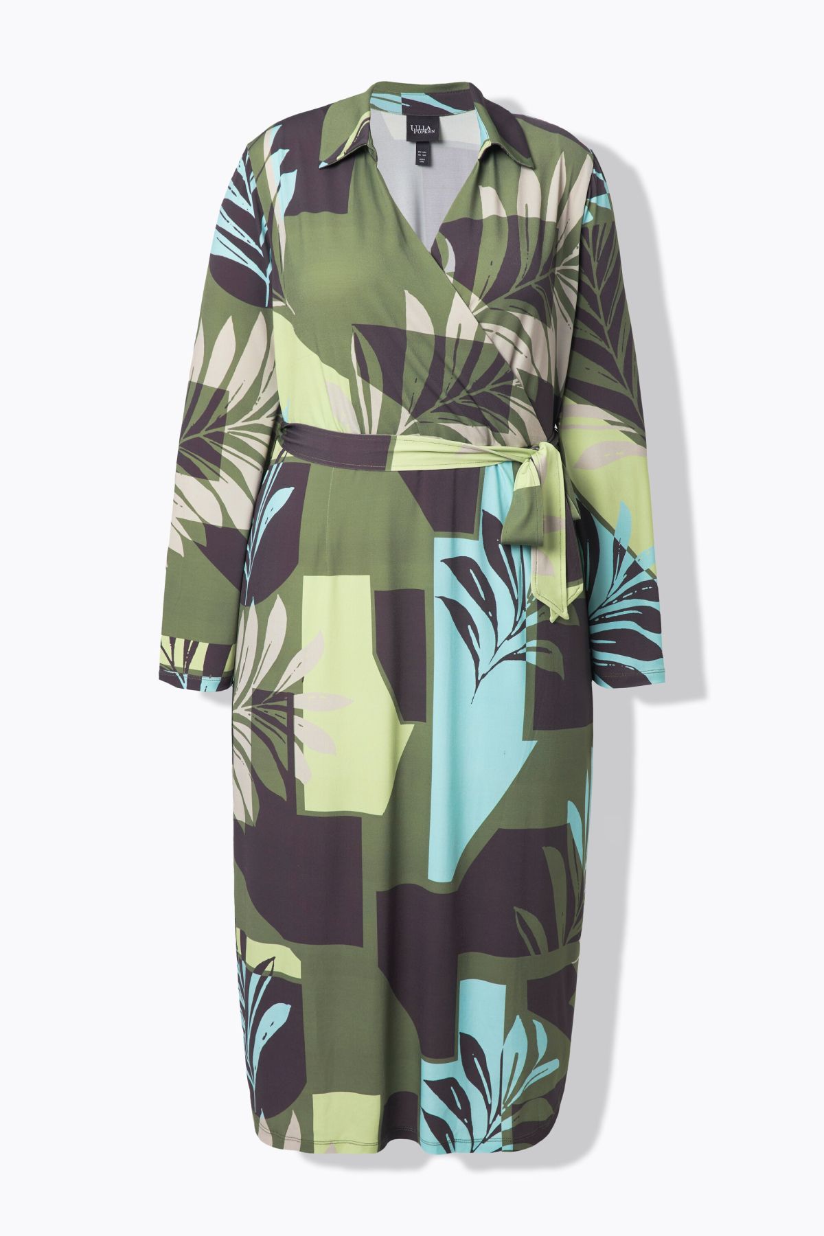 Midi-Jerseykleid, Classic Fit, aus angenehm elastischem Jersey mit grafischem Blättermuster und femininer Wickeloptik. Hemdkragen mit V-Ausschnitt und Wickeleffekt bis zur Taille. Abnehmbarer Bindegürtel, Langarm, seitliche Nahttaschen.