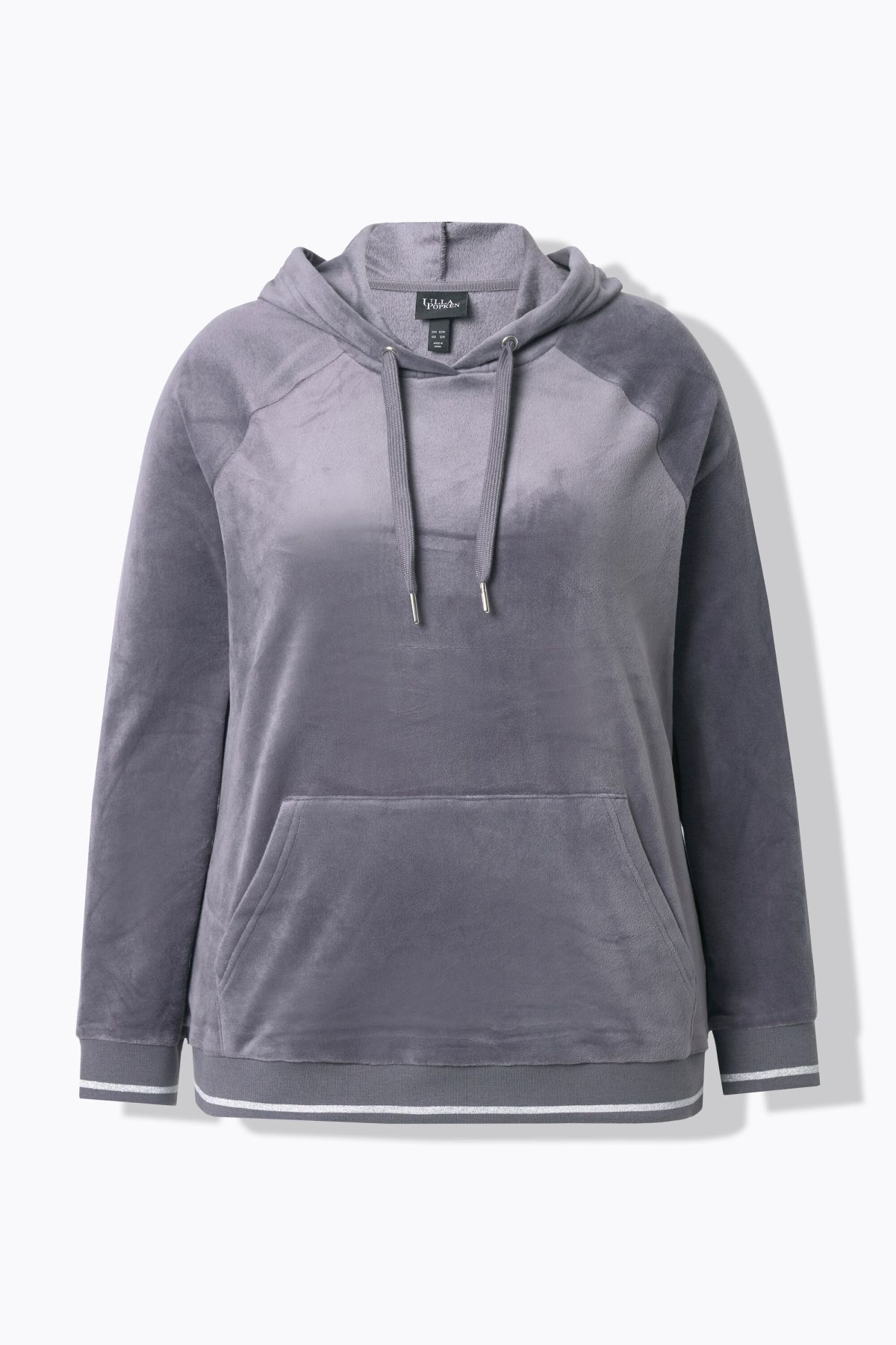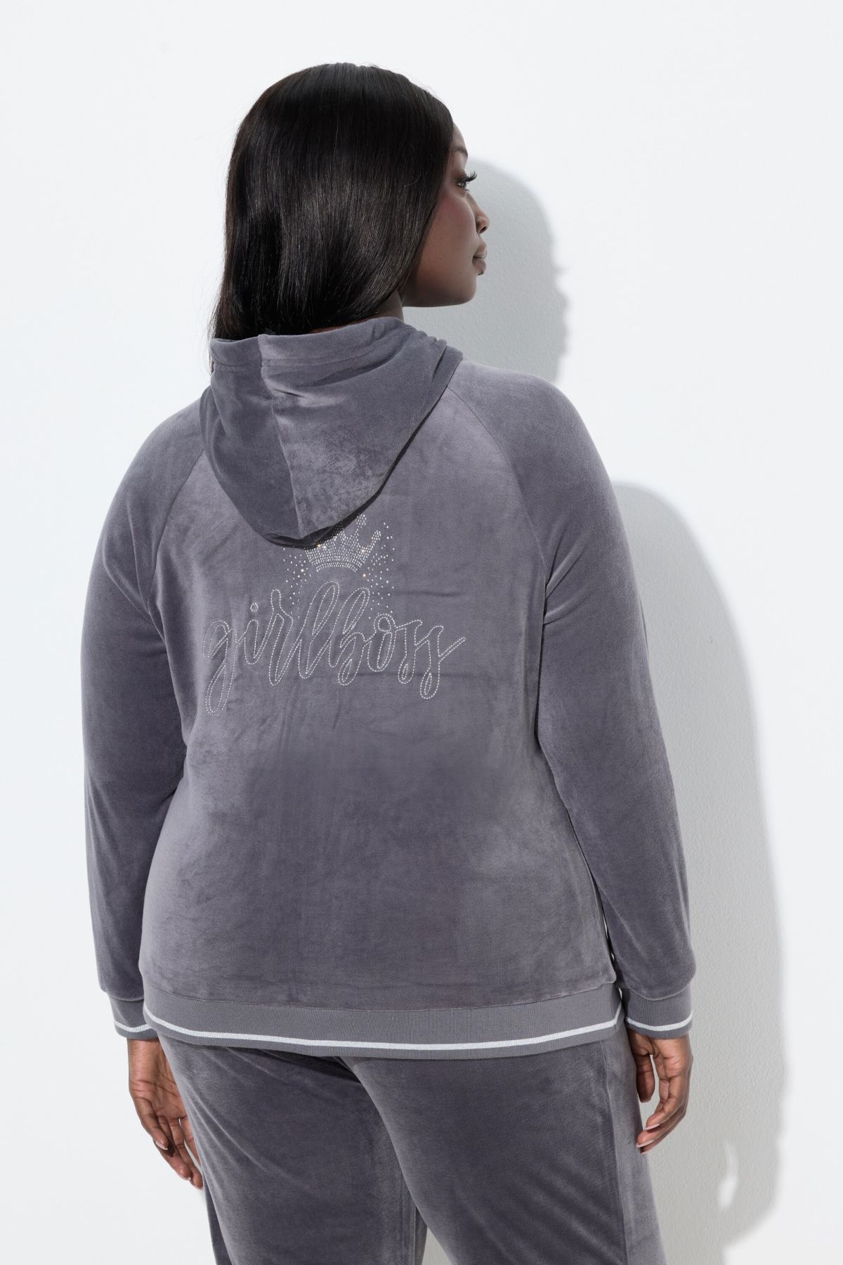 Homewear-Nickihoodie, bequeme Passform, superbequem und kuschelweich aus Nicki. Girlboss-Stickerei mit Ziersteinchen auf dem Rücken. Bündchen mit Glitzerstreifen. Kapuze, Kängurutasche, Raglan-Langarm, Rippbündchen.