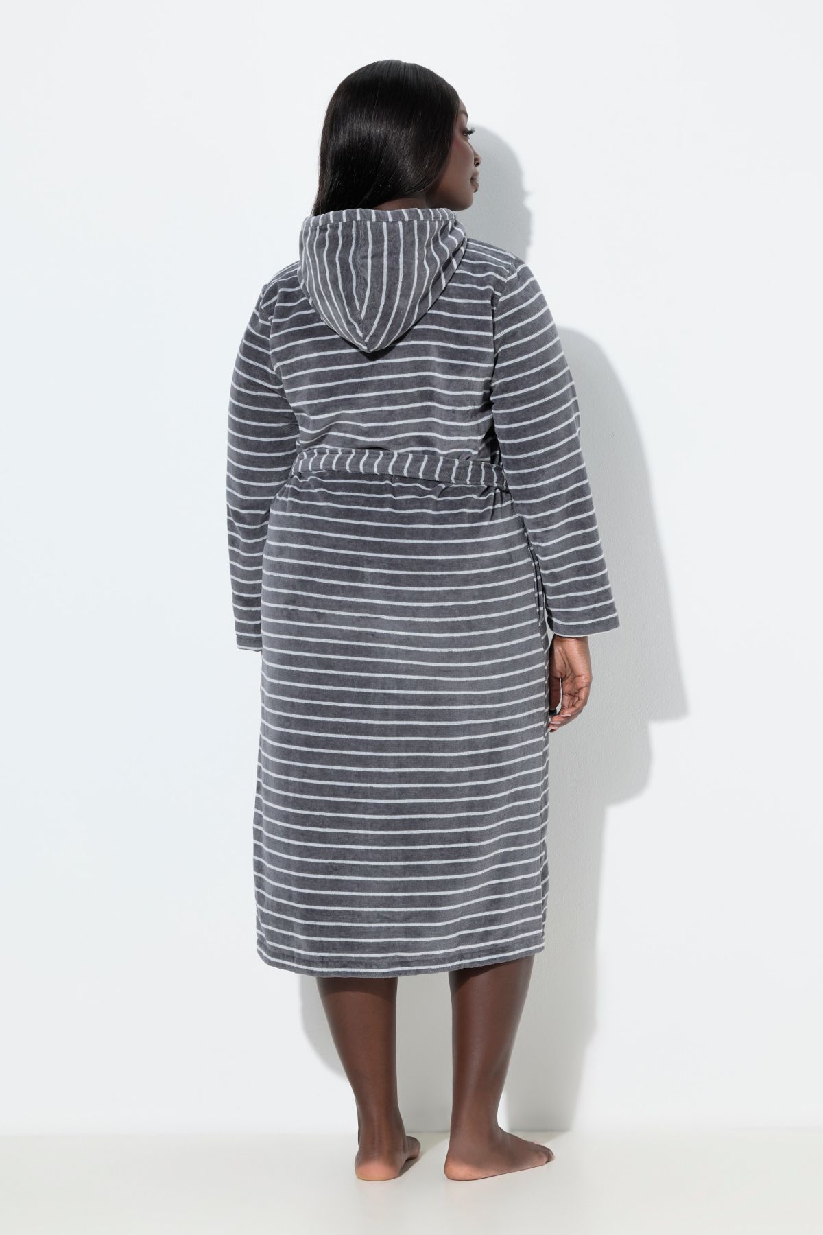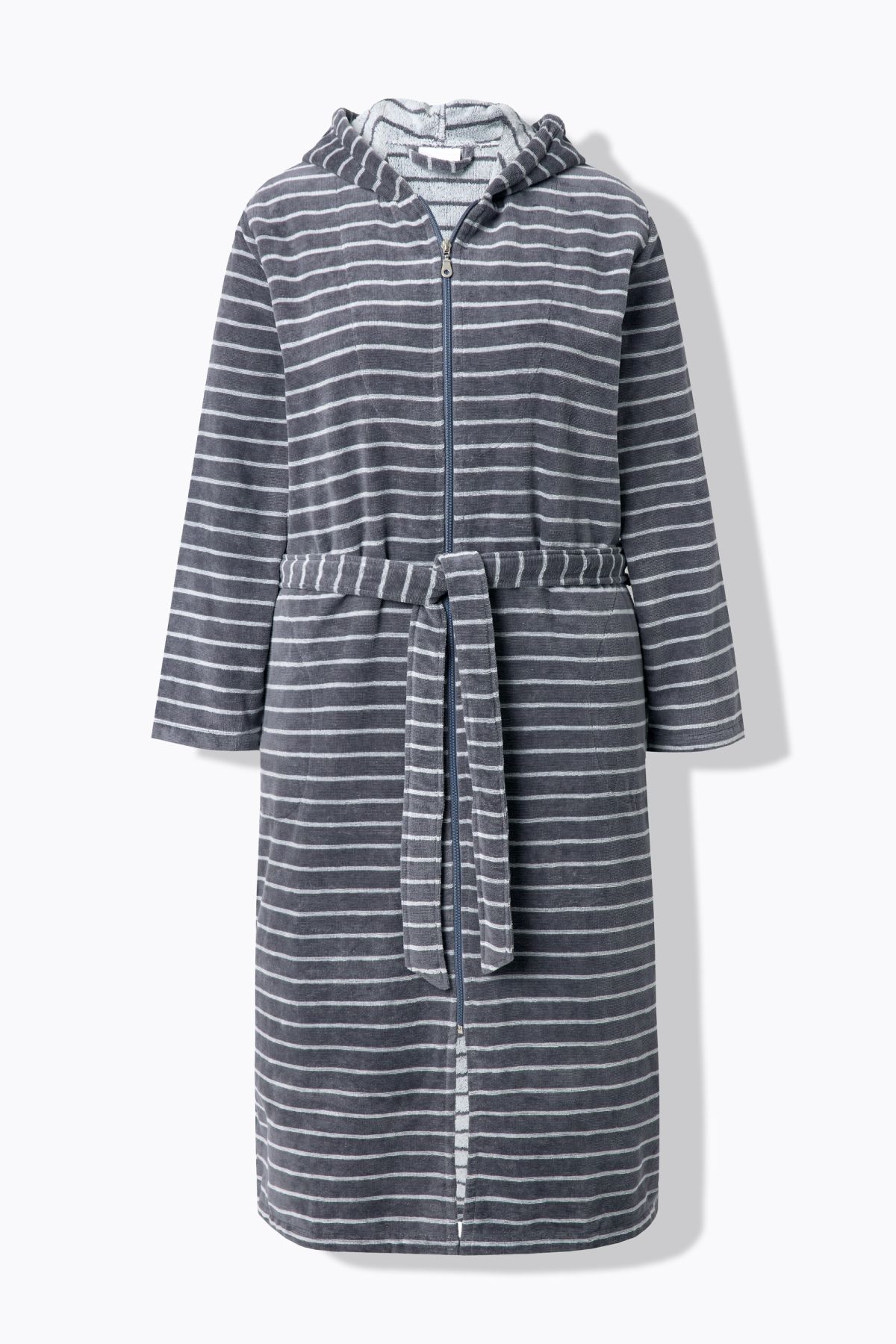 außen aus weichem Nicki mit Ringeln, Innenseite aus Frottee, Reißverschluss und Bindegürtel, dezente Nahttaschen, OEKO-TEX, Länge ca. 120 cm.