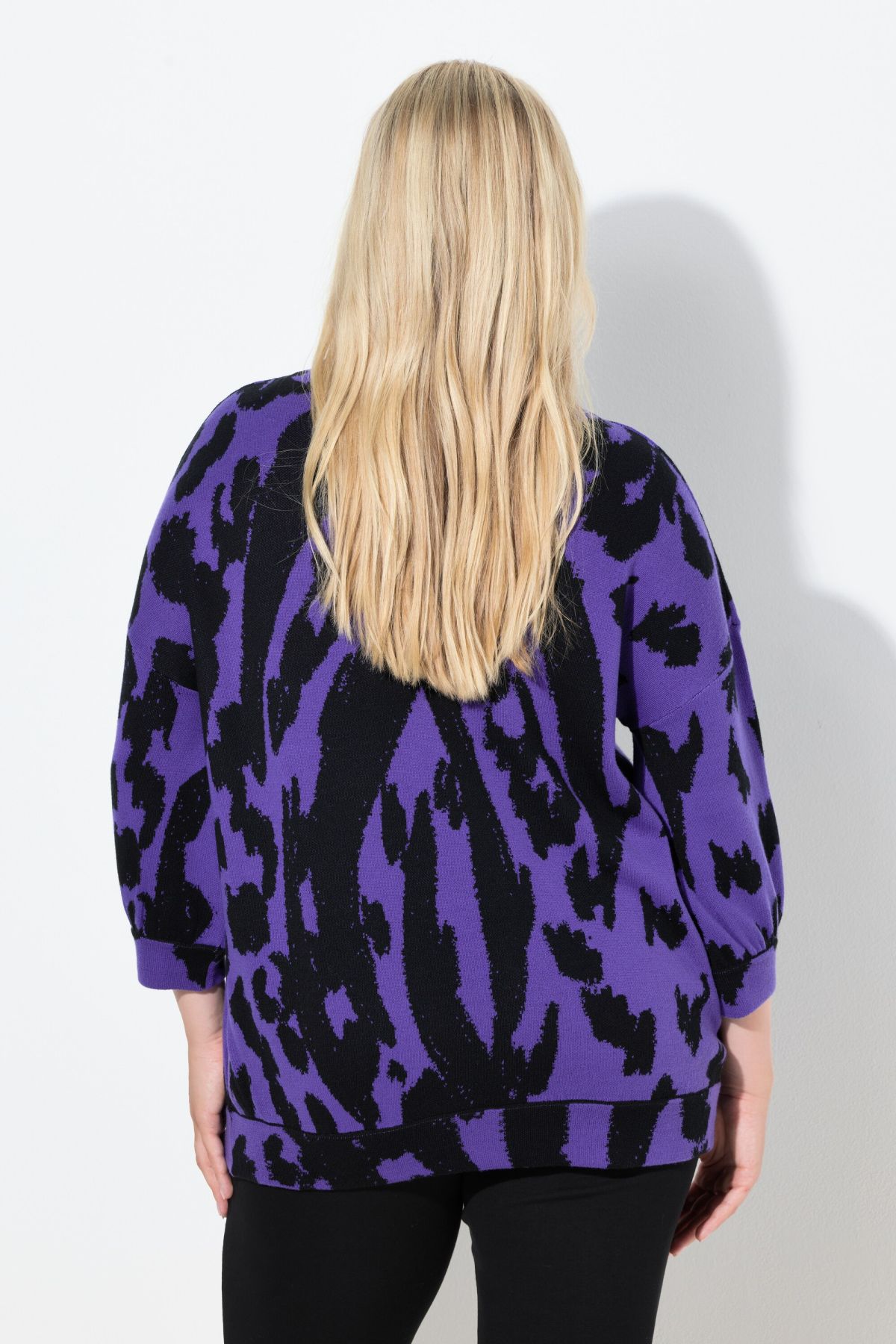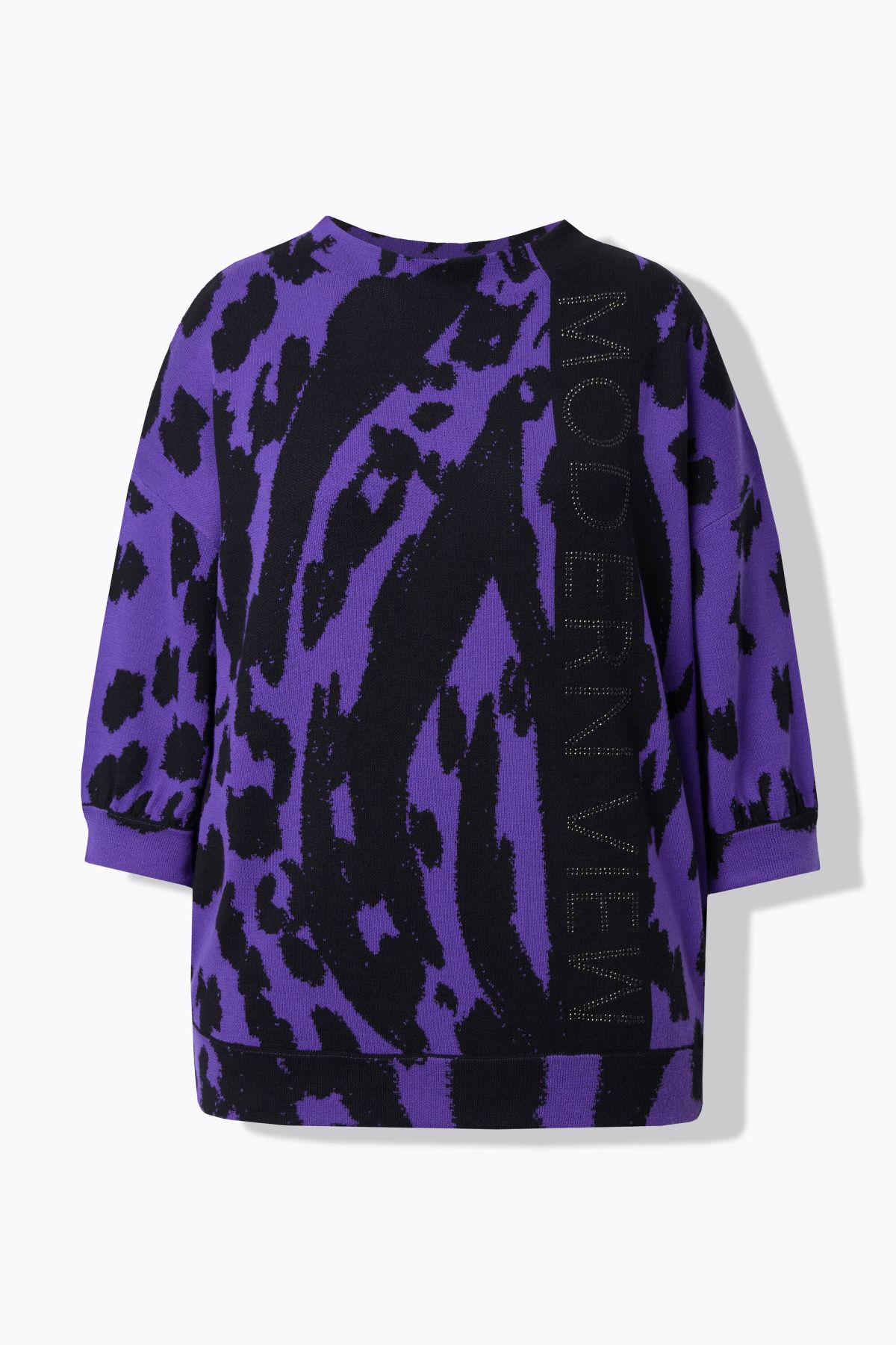 Jacquard-Pullover, oversized, aus weichem Feinstrick mit zweifarbigem Animal-Muster und Glitzersteinchen-Schriftzug. Angestrickter Stehkragen, überschnittene Schultern, 3/4-Ärmel. Rippbündchen mit Ziernaht.