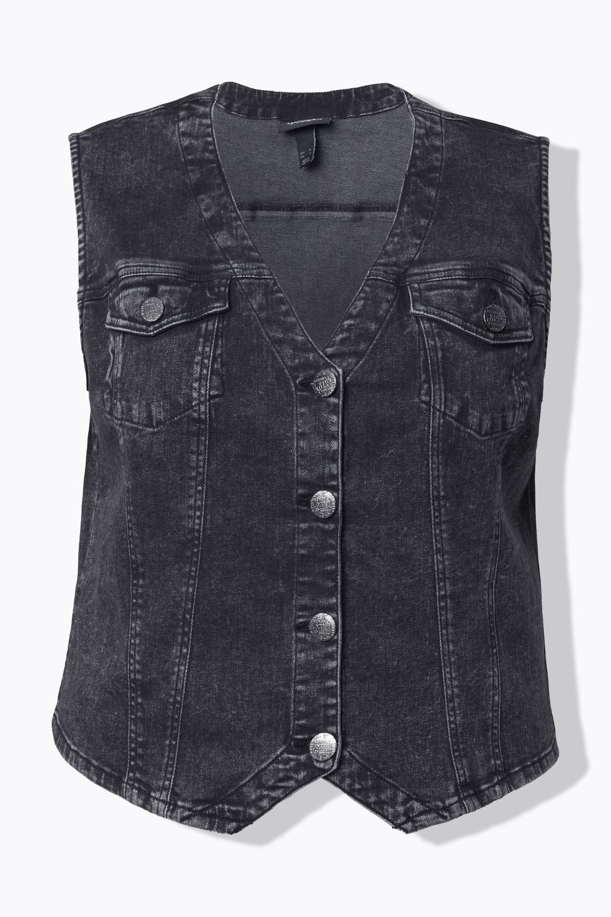 Jeansweste, bequeme, körpernahe Passform, aus angenehm elastischem Denim - modisch vorgewaschen. Gerundeter V-Ausschnitt, Knopfleiste, 2 Brusttaschen mit Ziernähten. Spitzsaum.