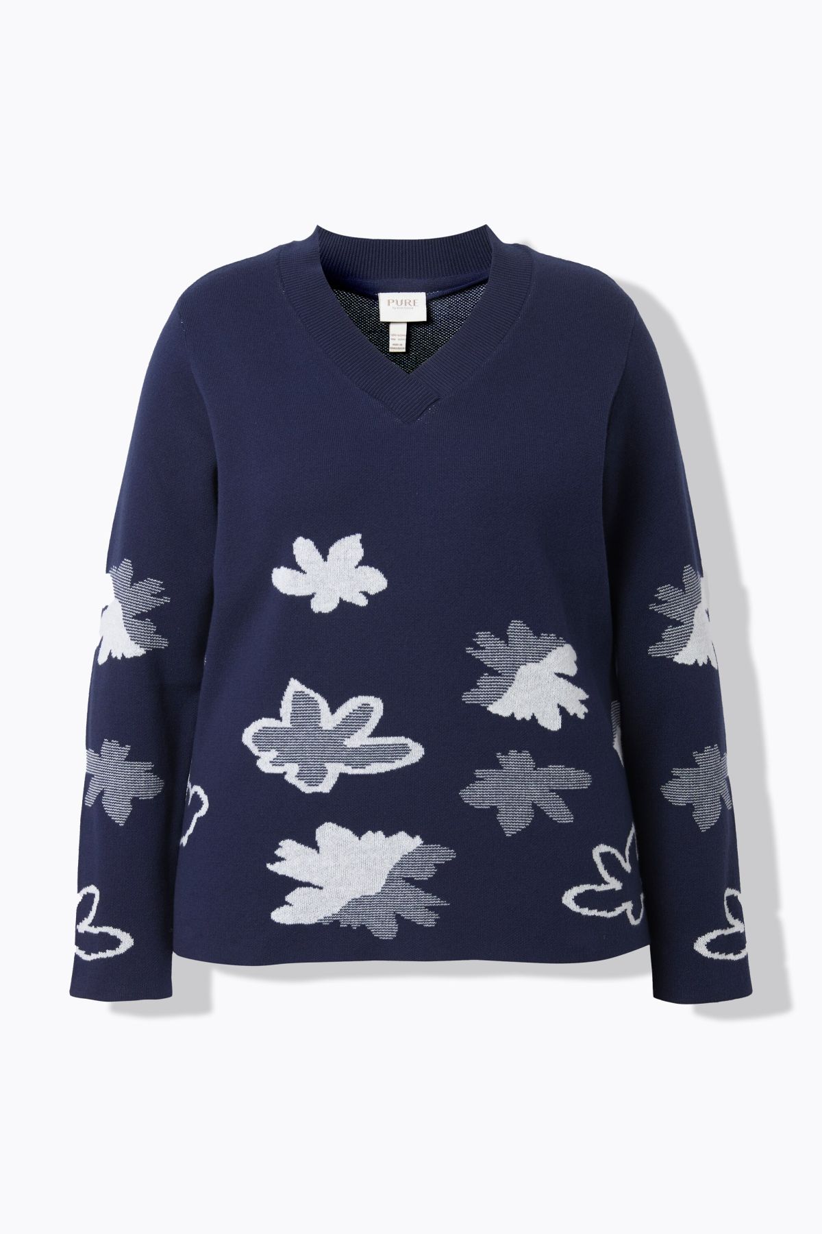Pullover aus Biobaumwolle. Bequemer Regular Fit aus Jacquardstrick mit Blumenmuster. V-Ausschnitt, Langarm, glatte Abschlüsse. Hochwertige Fully-Fashioned-Verarbeitung. Organic; certified by ECOCERT Greenlife Licence no. 152026.