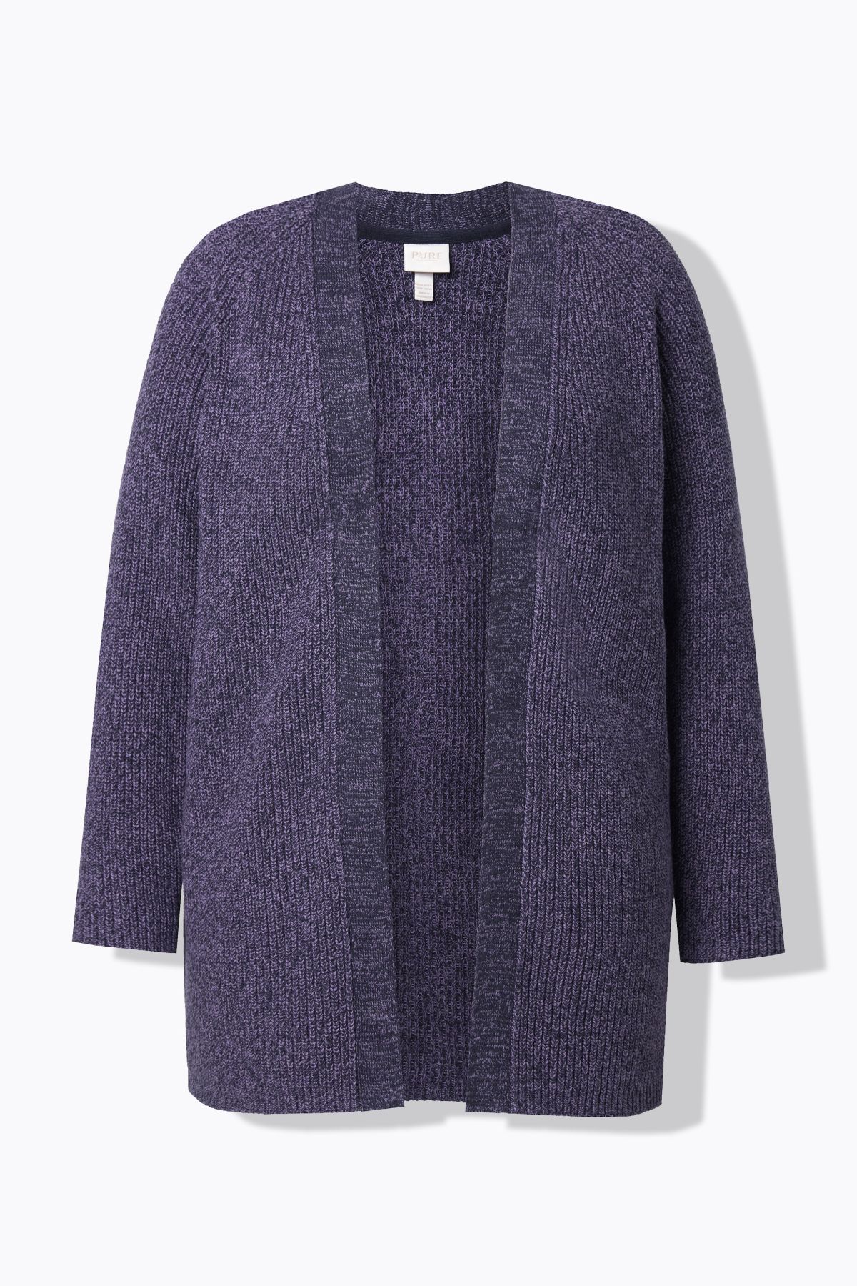 zweifarbig melierter Rippstrick, moderne, offene Form ohne Verschluss, Raglan-Langarm, schmale Rippbündchen, nachhaltige Biobaumwolle, Größenangepasste Länge ca. 76-80 cm.