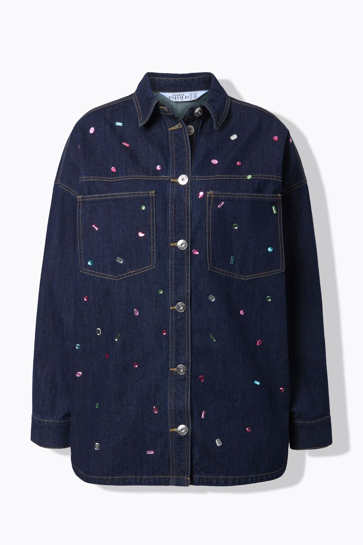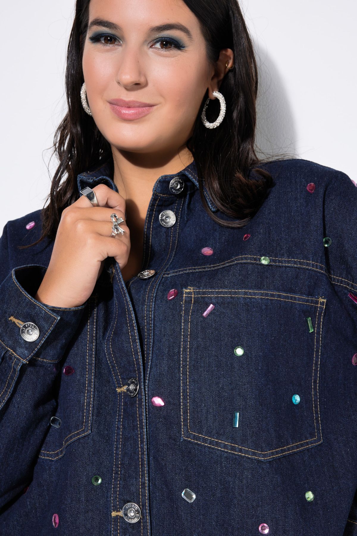 Chemisier en jean oversize, petites pierres scintillantes