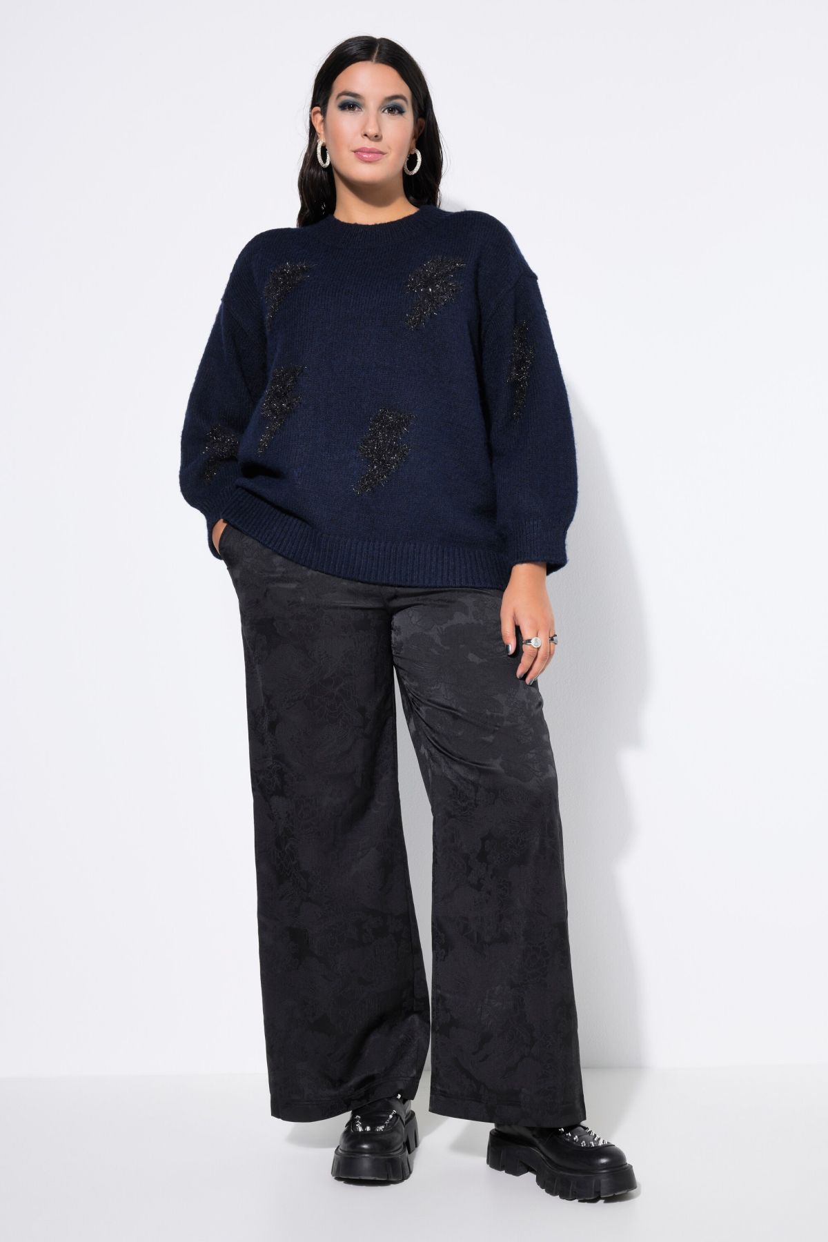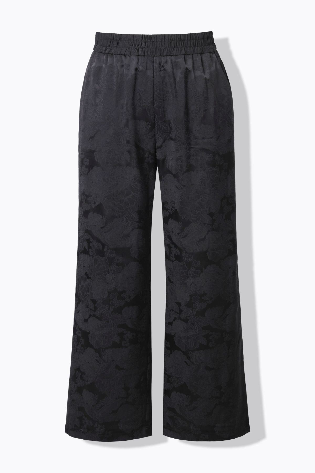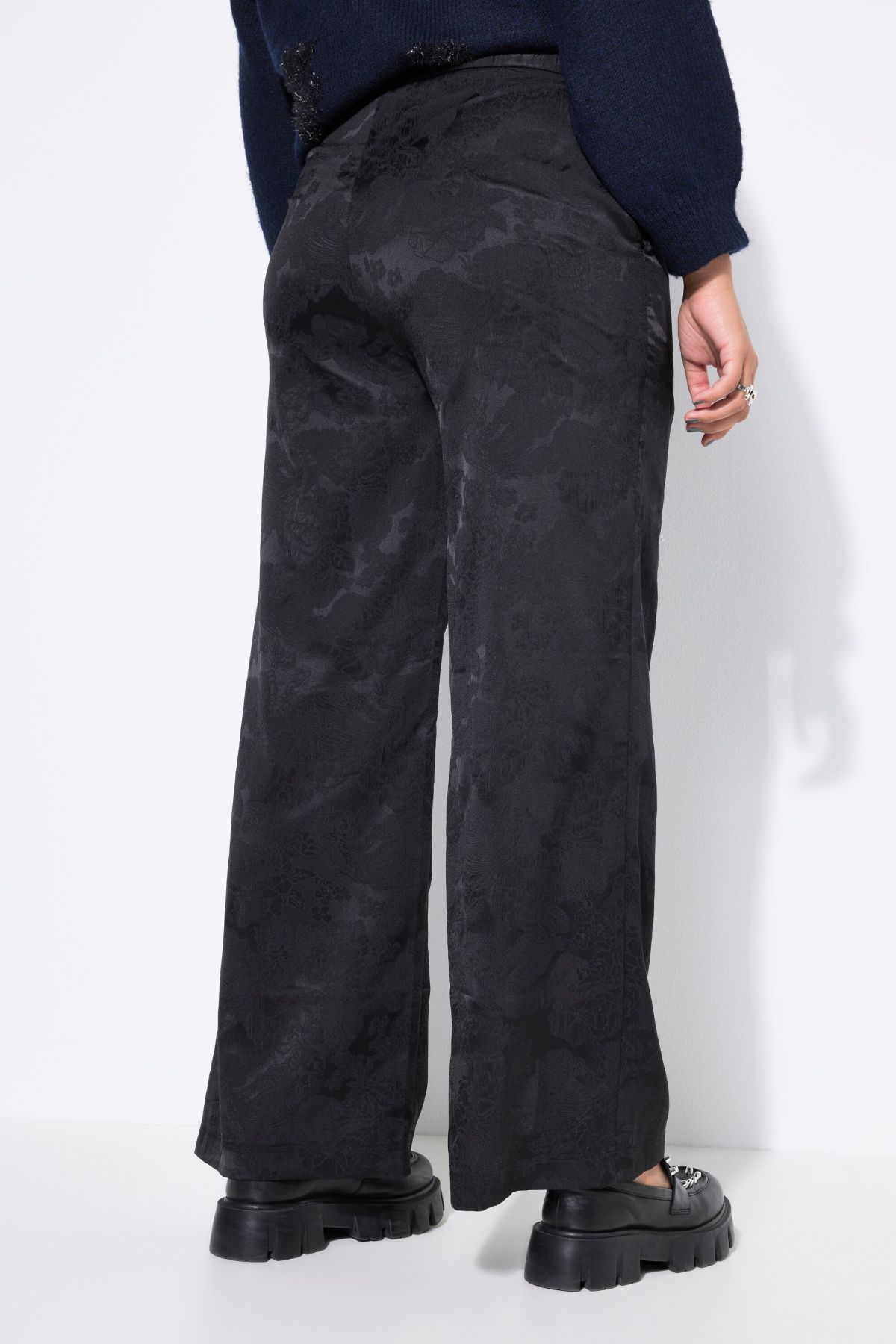 Wide Legs, glatter Jacquard-Krepp, florales Muster, Elastikbund, seitliche Taschen, Schrittlänge ca. 78 cm.