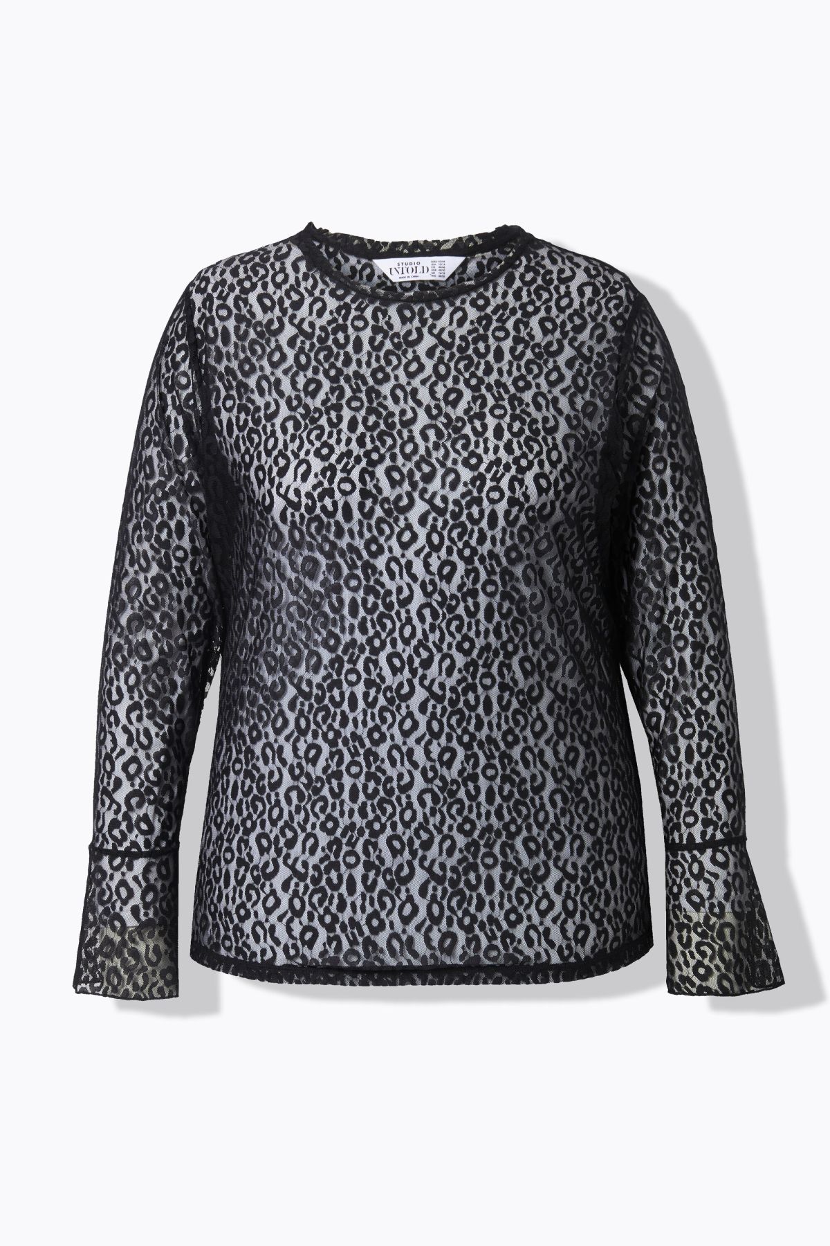 Coupe Slim Shape, Dentelle léopard transparente, Décolleté rond, Manches longues avec volant, Long. selon taille env. 65-73 cm.