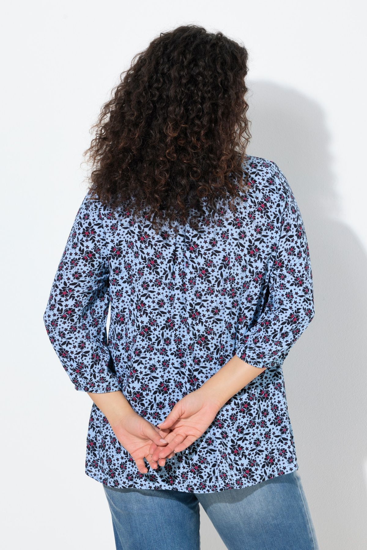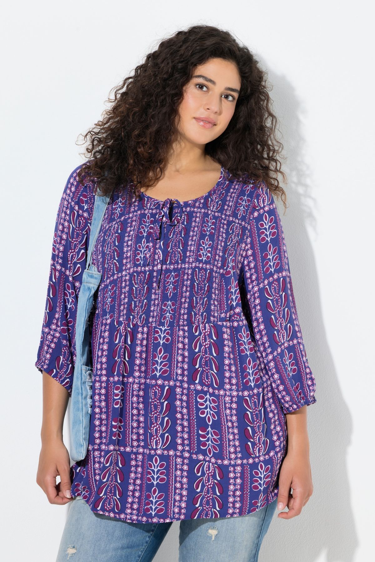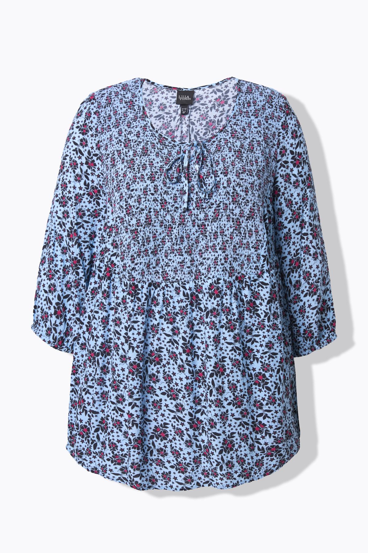 Smokbluse, bequeme Passform, aus weichem Krepp mit Alloverdruck. Elastisch gesmokte Büste mit Rundhalsausschnitt, Schlitz und Bindeband. 3/4-Ärmel mit elastischem Abschluss.