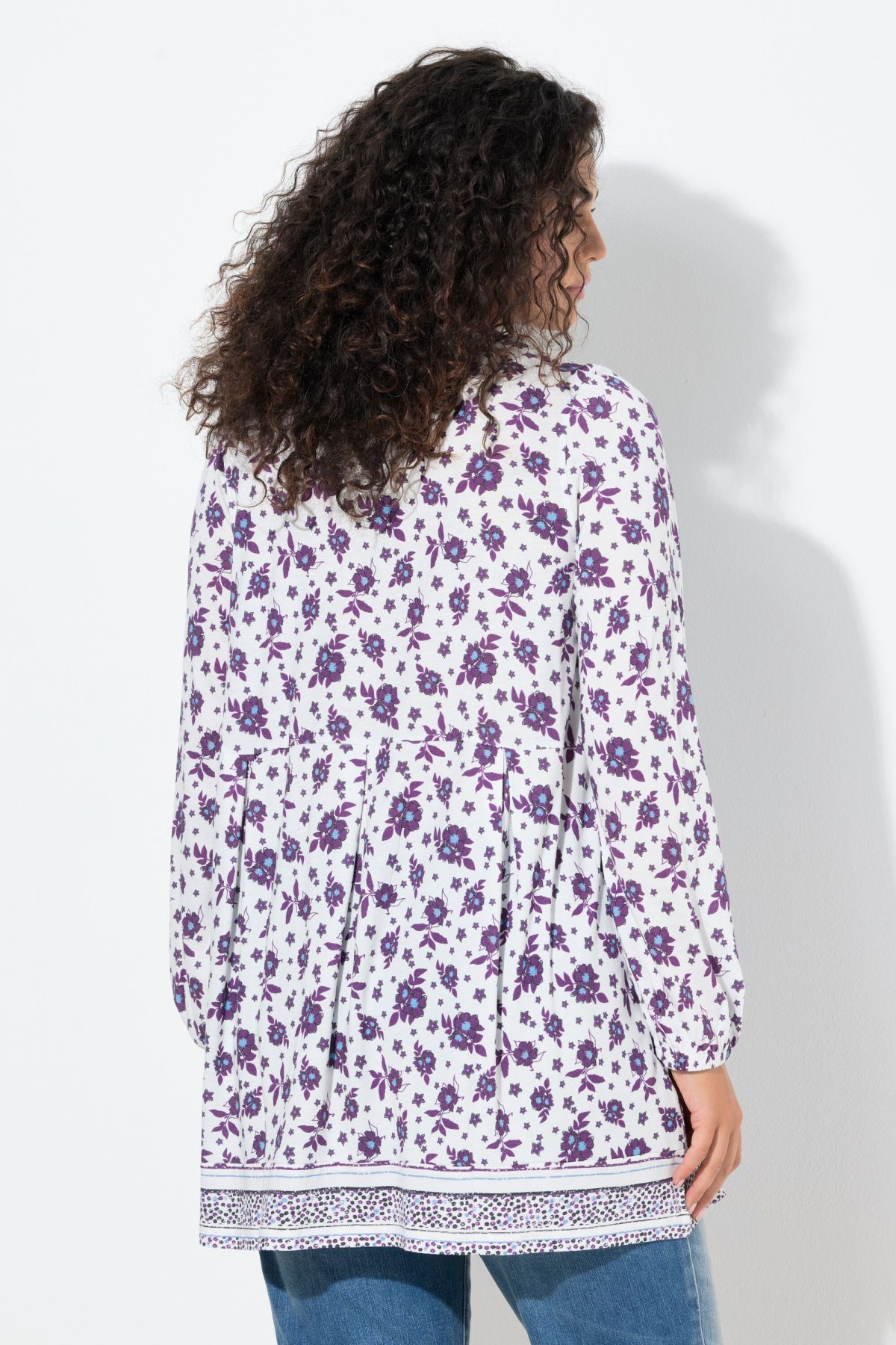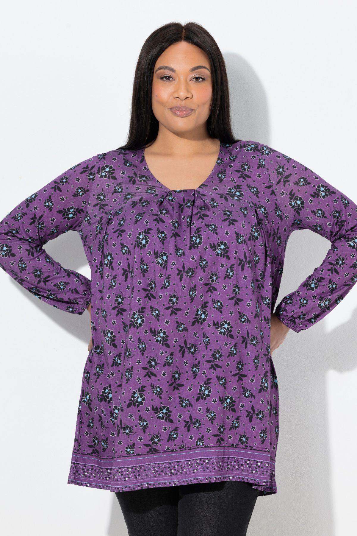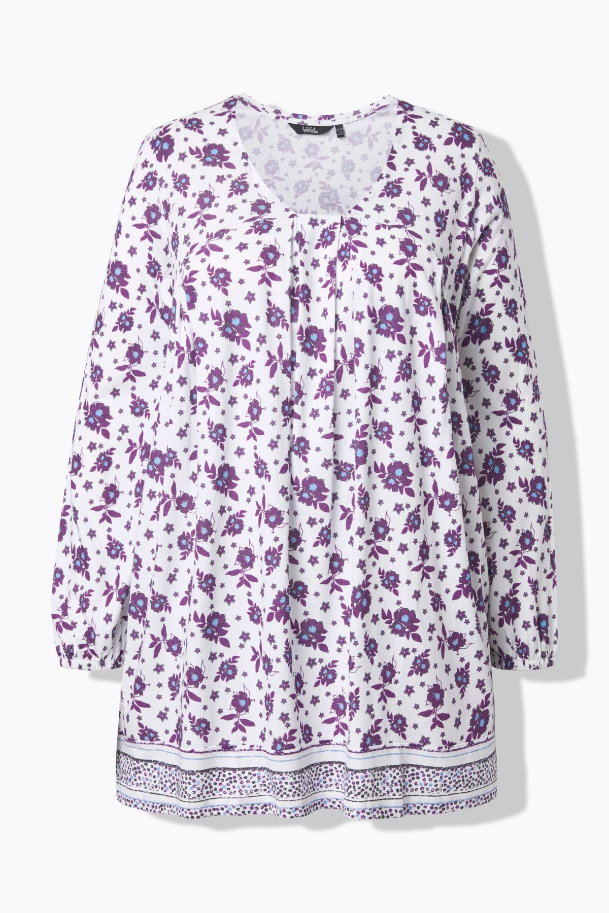 T-Shirt, A-Linie, aus weichem Cupromix-Jersey mit Blumenmuster. Carré-Ausschnitt, darunter gebogene Quernaht mit Godetfalten - extrabequeme Saumweite mit dekorativer Bordüre. Langarm mit elastischem Abschluss.