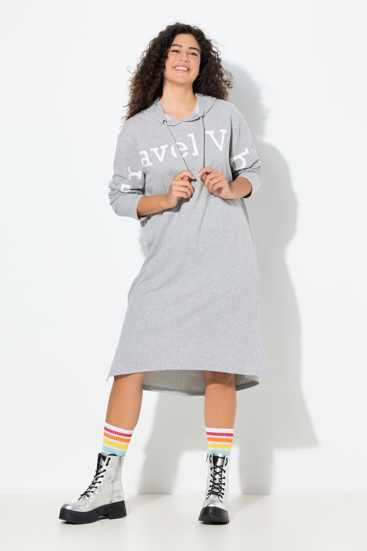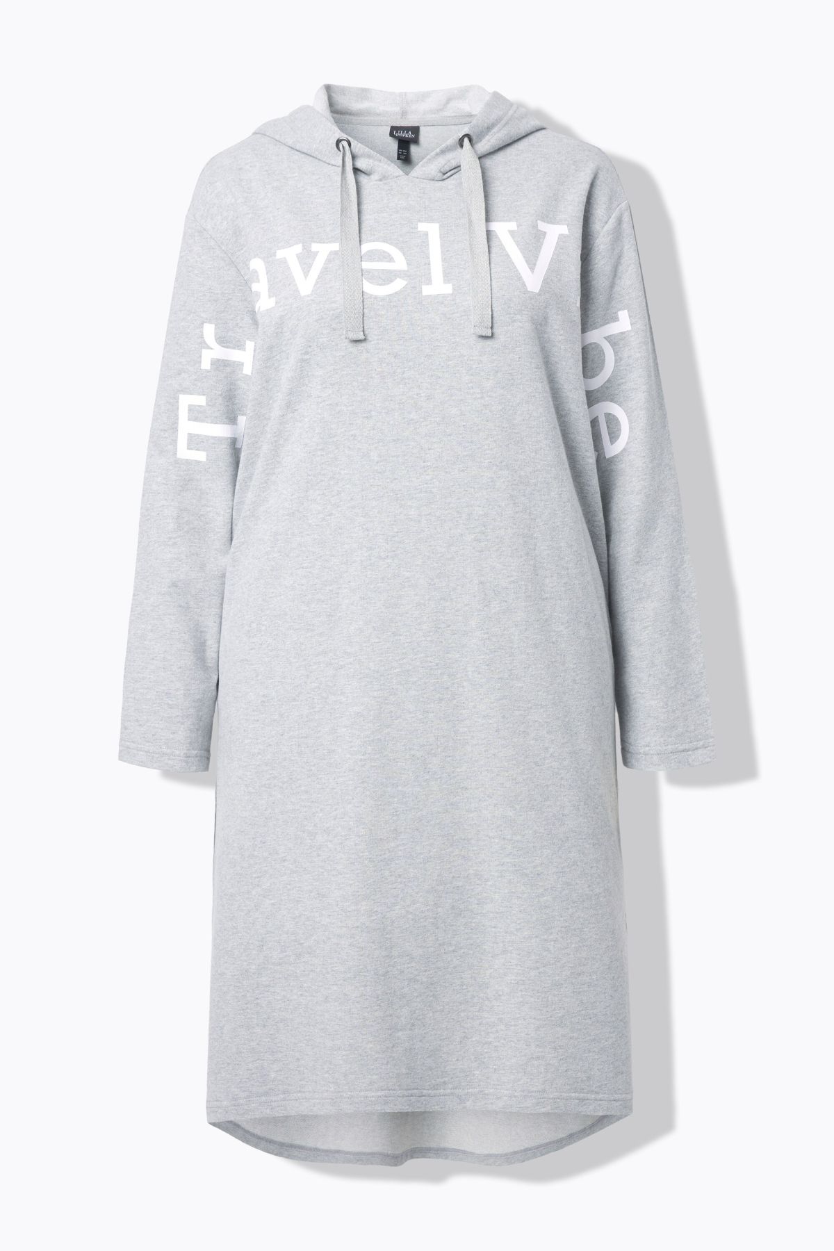 Sweat-Midikleid, bequeme Passform, aus weichem Sweat, weich angeraut und angenehm warm. Großer Schriftzug, Kapuze mit Bindeband, überschnittene Schultern, Langarm. Seitenschlitze für noch mehr Tragekomfort.
