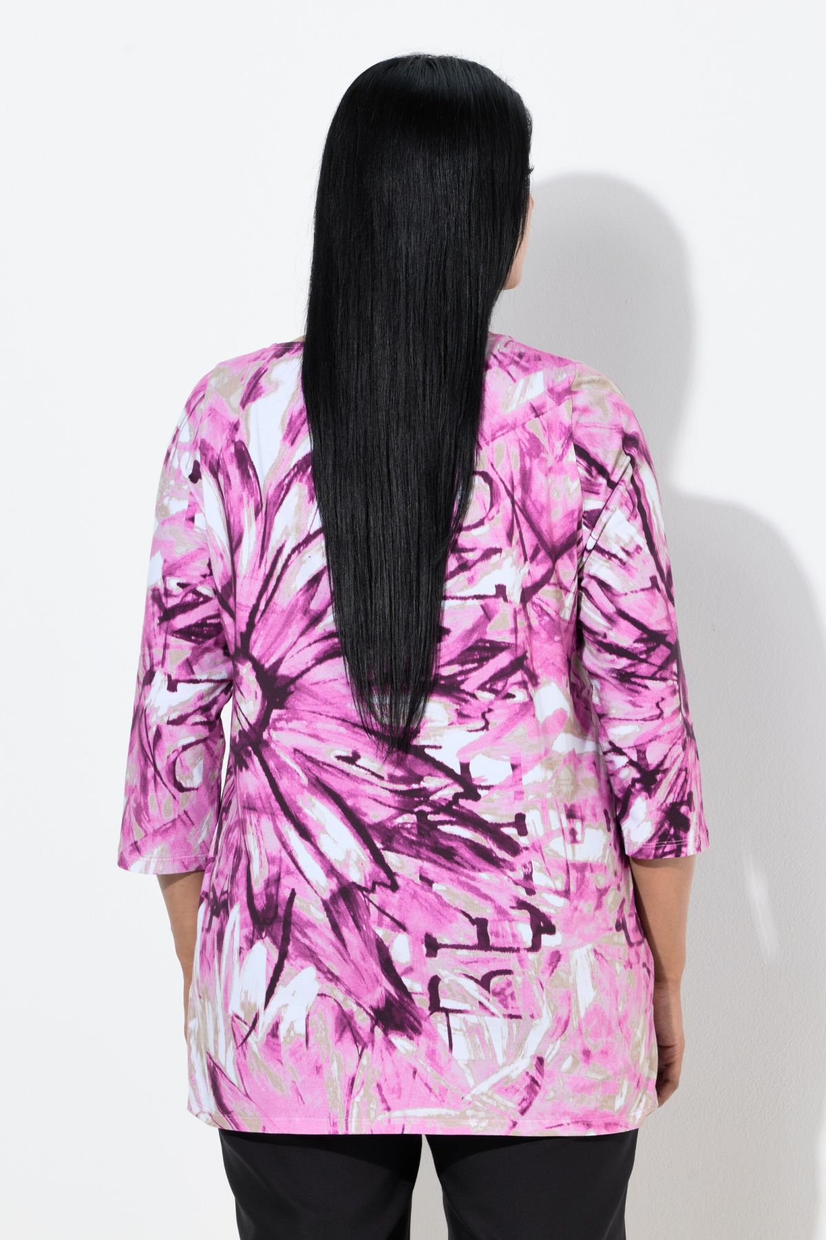 Shirt, A-Linie, aus hochwertigem, extraweichen Jersey mit Glitzersteinchen auf dem floralen Design. U-Boot-Ausschnitt, 3/4-Ärmel. Seitenschlitze für noch mehr Tragekomfort. Pima-Baumwolle wird aufgrund ihrer fantastischen Eigenschaften auch als Seide Südamerikas bezeichnet. Diese anspruchsvolle Baumwollsorte zeichnet sich aus durch besonders lange und feine Fasern. Das macht sie ausgesprochen weich und langlebig und verleiht ihr einen seidigen Glanz - ideal für Menschen mit empfindlicher Haut.& 10;<br> & 10;<br>Premium-Mode für Dich! & 10;<br>selection by Ulla Popken steht für Qualität und tragbare Eleganz. Klassiker verwandelt selection by Ulla Popken in moderne Highlights aus hochwertigen Materialien mit aufwendigen Drucken und Details – perfekt für jeden Tag und besondere Anlässe! & 10;<br>& 10;<br>& 10;