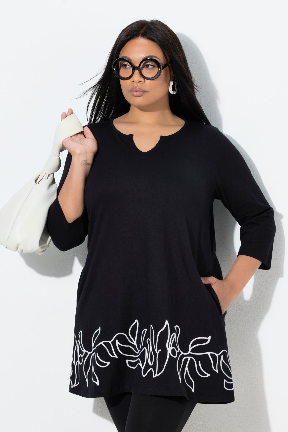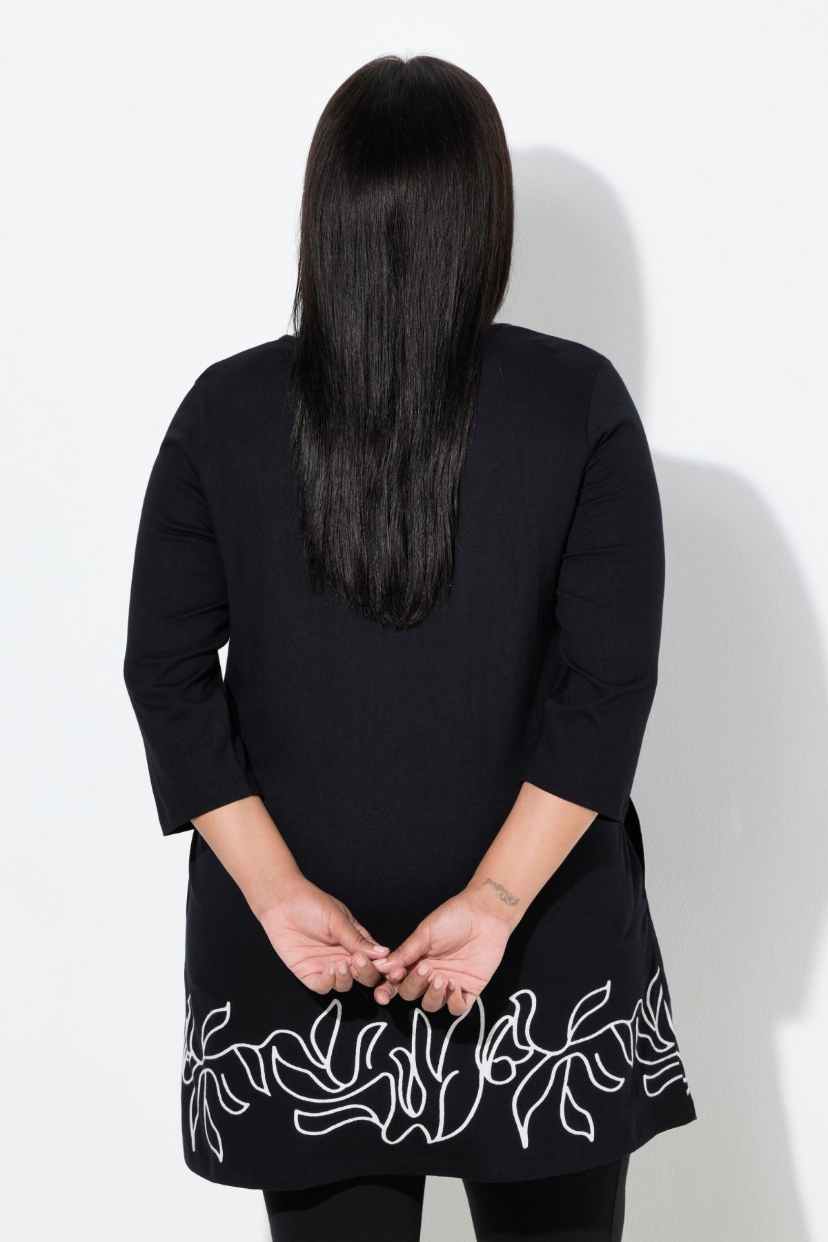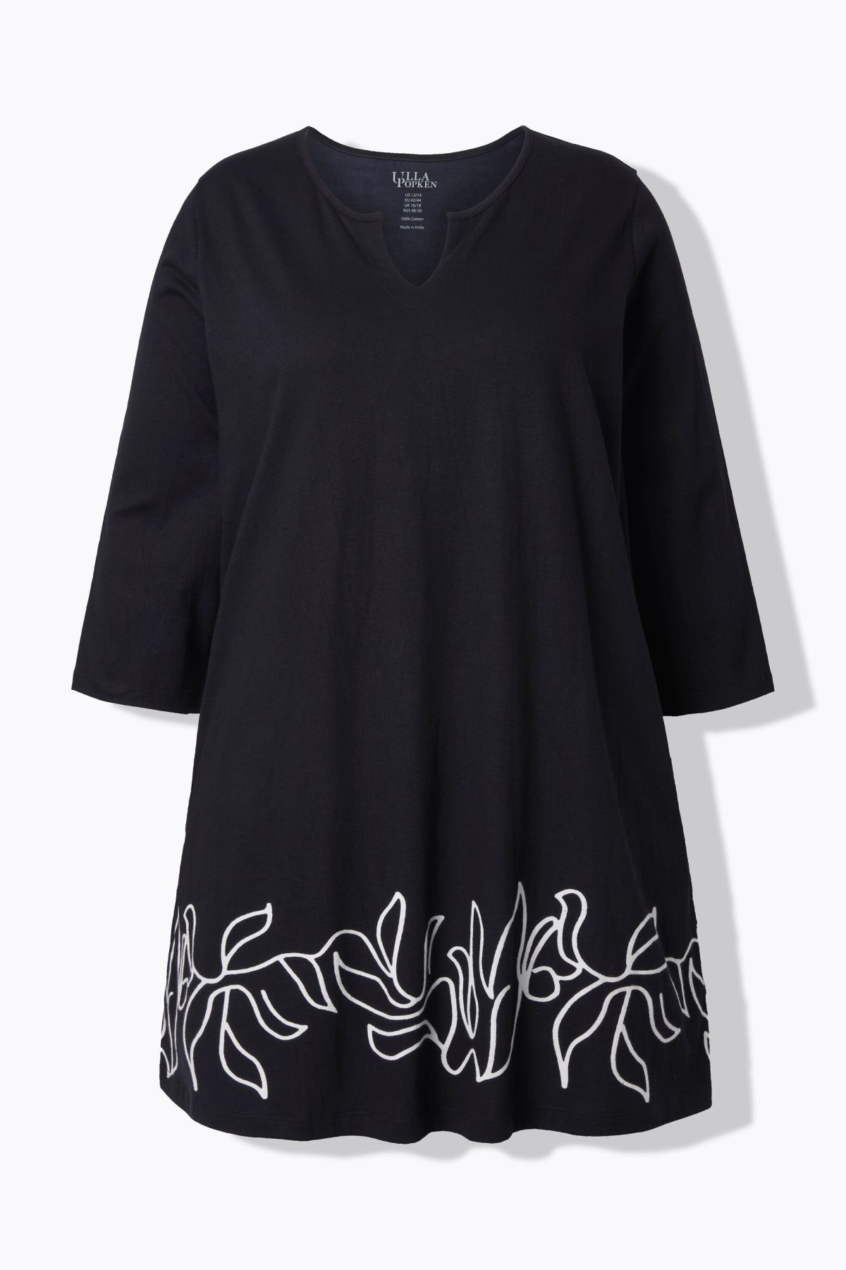 dekorativer Motivdruck, femininer Tunika-Ausschnitt, längere A-Linie mit bequemer Saumweite, 3/4-Ärmel, reine Baumwolle, Größenangepasste Länge ca. 86 cm.