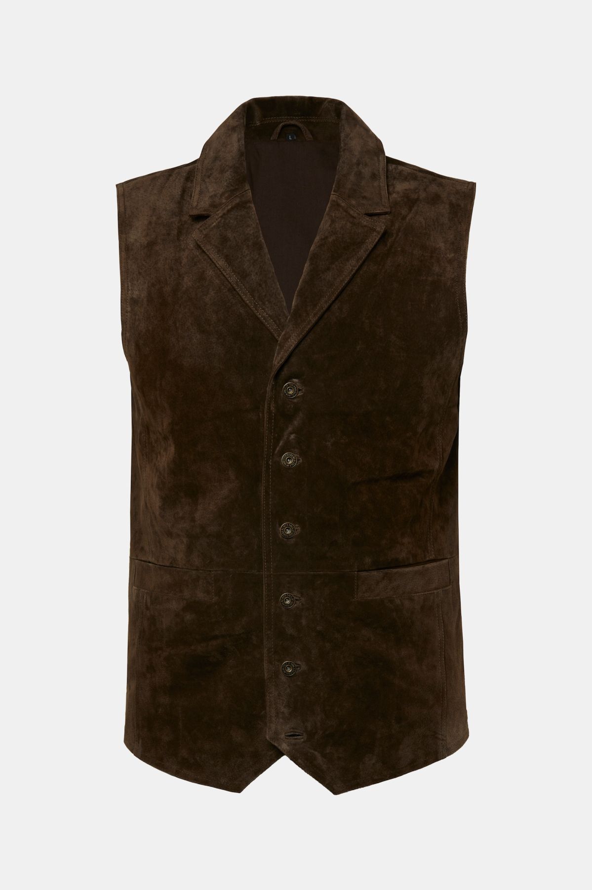 Cuir suédé d'une grande souplesse, Col à revers, Patte de boutonnage, Base se terminant en pointe sur le devant, Doublure intégrale, Long. selon taille env. 70-79 cm.