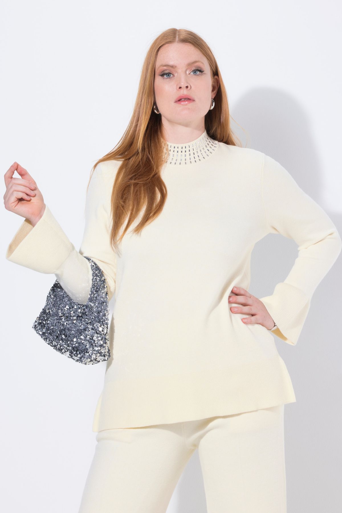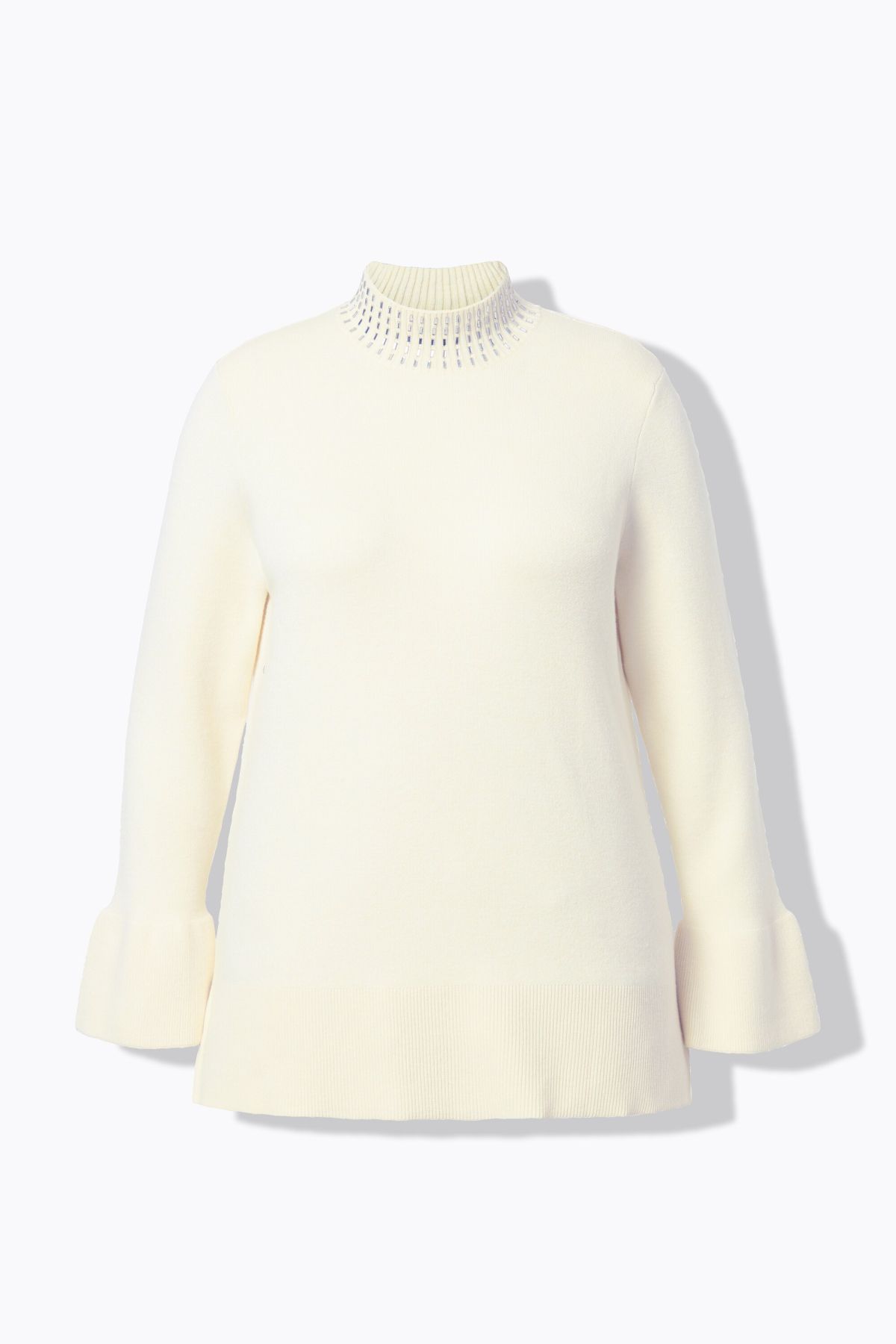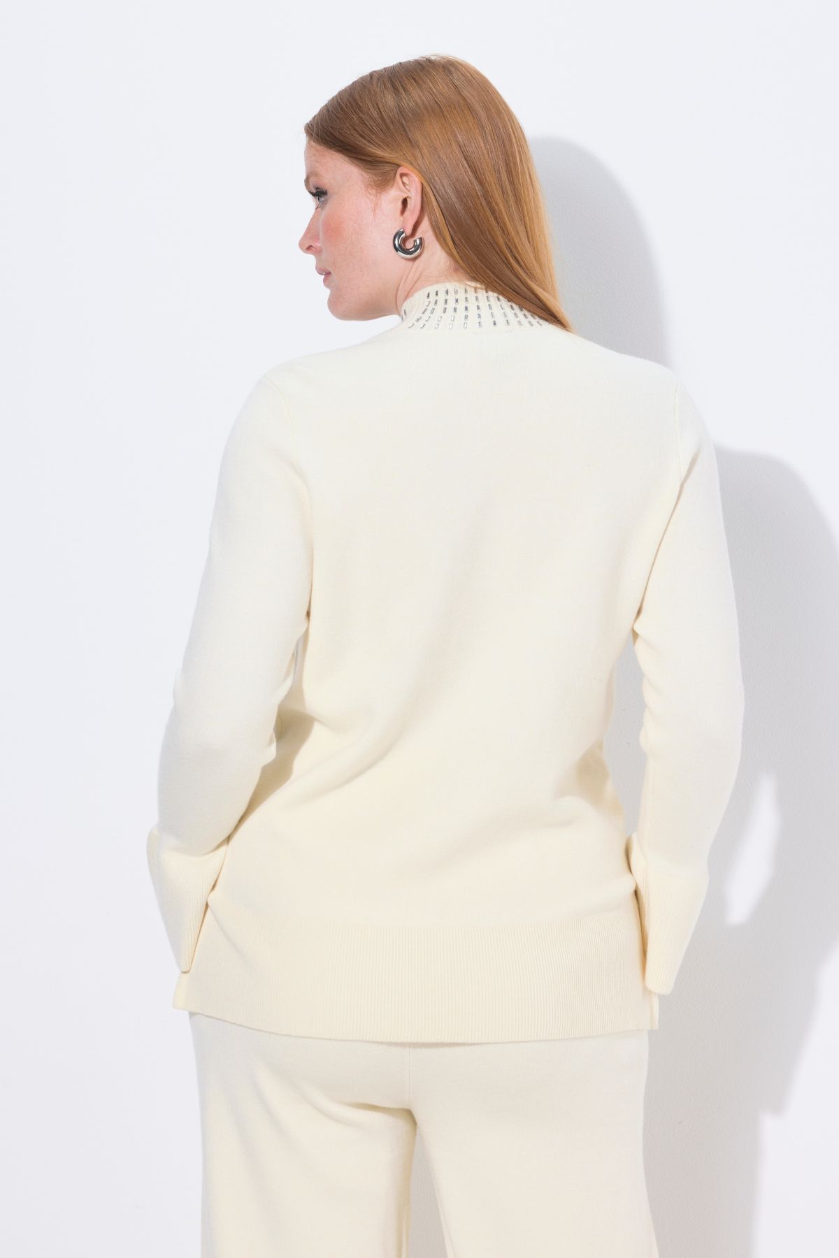 Ärmel mit modischem Volant, breiter Stehkragen mit Glitzersteinchen, bequeme Passform mit Seitenschlitzen, Langarm, weicher Viskose-Feinstrick, Größenangepasste Länge ca. 72-76 cm.