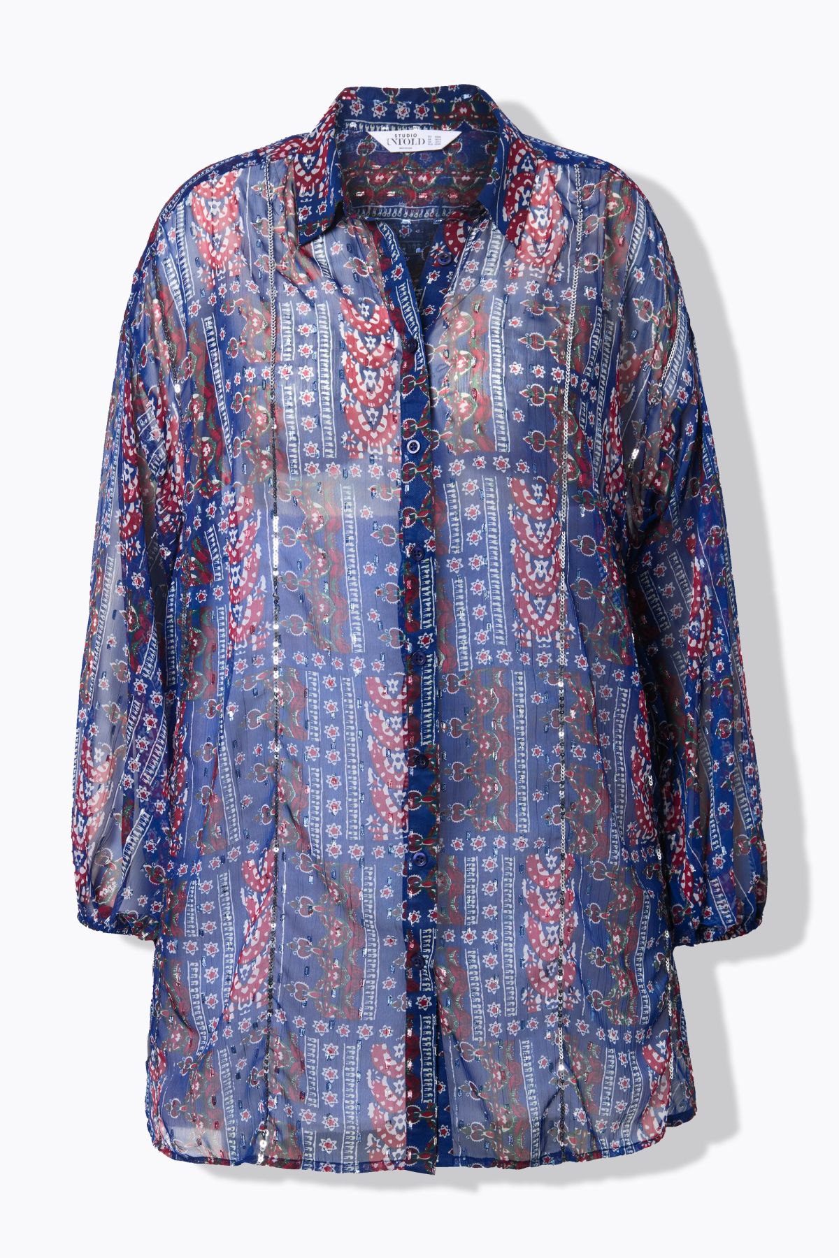 Coupe Loose Shape, Tissu mousseline, mélange d'imprimés et rayures scintillantes, Décolleté en V, Manches longues ballon, Long. selon taille env. 70 cm.