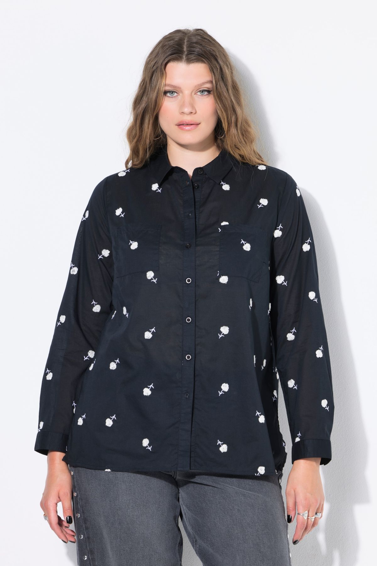 Coupe Boxy Shape « flottante », Véritables broderies à motif floral, Col chemise classique, Manches longues à poignets, Fentes sur les côtés, Long. selon taille env. 70-78 cm.