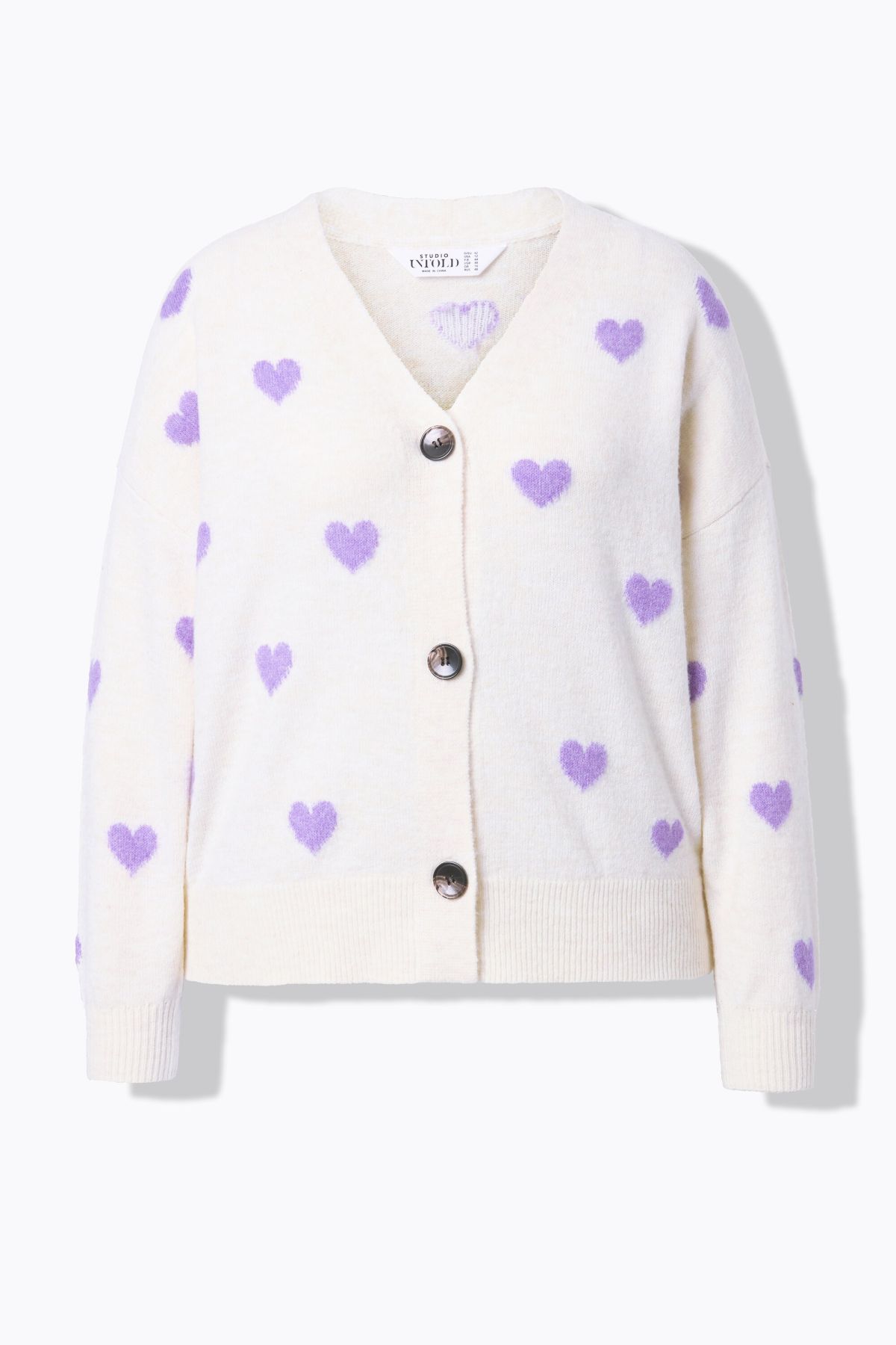 Coupe oversize, Maille fine, douce et confortable, Motif cœurs all-over (intégral), Encolure en V et patte de boutonnage, Finitions bords-côtes, Long. env. 62-66 cm.