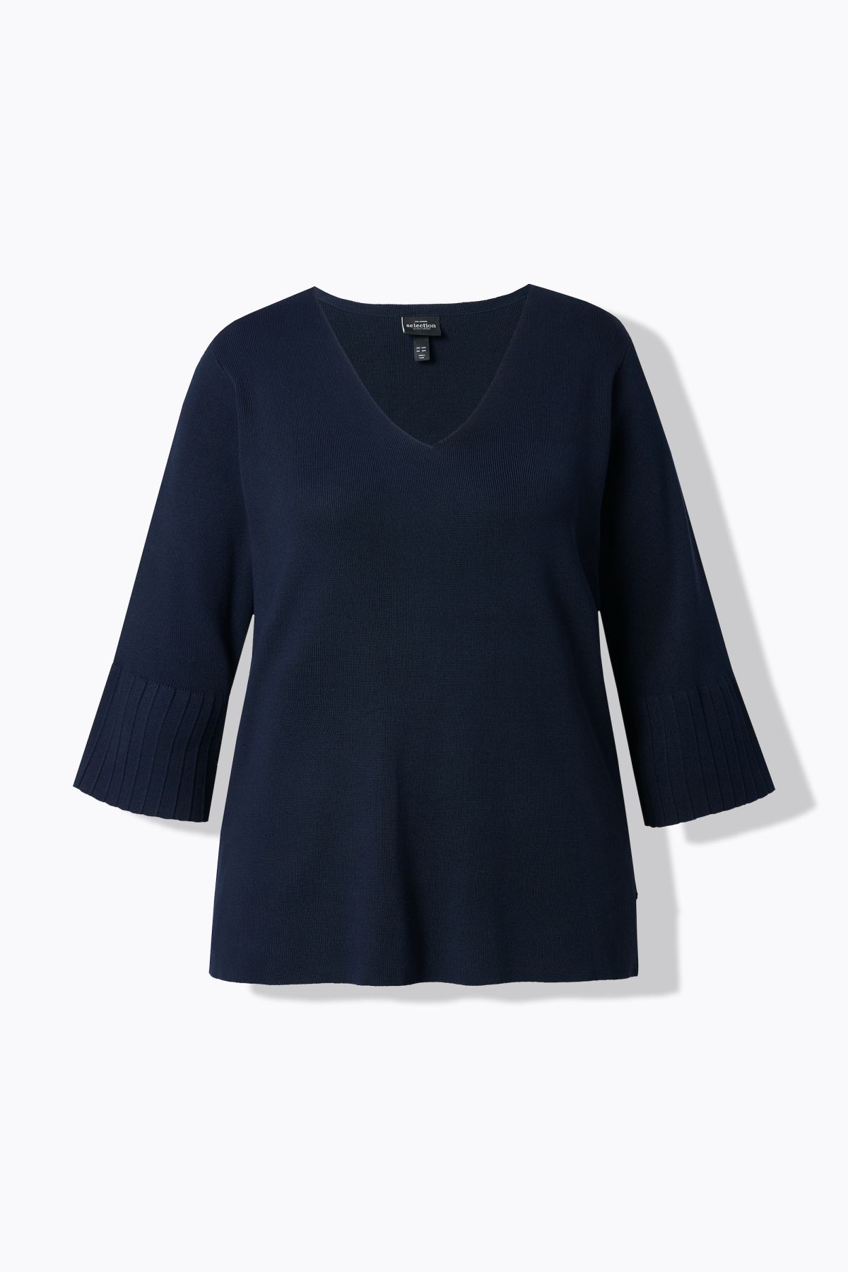 Pulli, bequemer Classic Fit, aus weichem Viskose-Feinrippstrick. Highlight: 3/4-Ärmel mit Faltenvolant am Abschluss. Hochwertige Fully-Fashioned-Verarbeitung mit V-Ausschnitt. & 10;<br>  & 10;<br>Premium-Mode für Dich! & 10;<br>selection by Ulla Popken steht für Qualität und tragbare Eleganz. Klassiker verwandelt selection by Ulla Popken in moderne Highlights aus hochwertigen Materialien mit aufwendigen Drucken und Details – perfekt für jeden Tag und besondere Anlässe! & 10;<br>& 10;<br>& 10;
