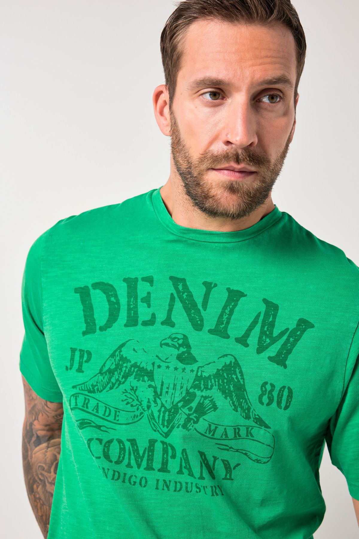 Coupe spéciale jusqu'au 8 XL, Jersey élégamment texturé, Style vintage - délavage acid washed, Imprimé sur la poitrine, Manches courtes, Long. selon taille env. 74-86 cm.