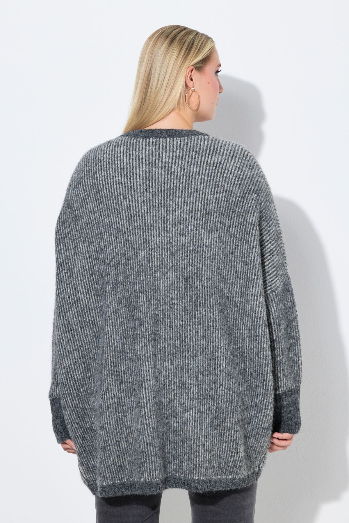 zweifarbiger Strick mit Wollanteil., modischer Egg-Shape, lässige, offene Form mit überschnittenen Schultern, Saum und weiter Langarm mit Rippbündchen, besser für die Umwelt: mit recyceltem Polyester, Größenangepasste Länge ca. 77-81 cm.