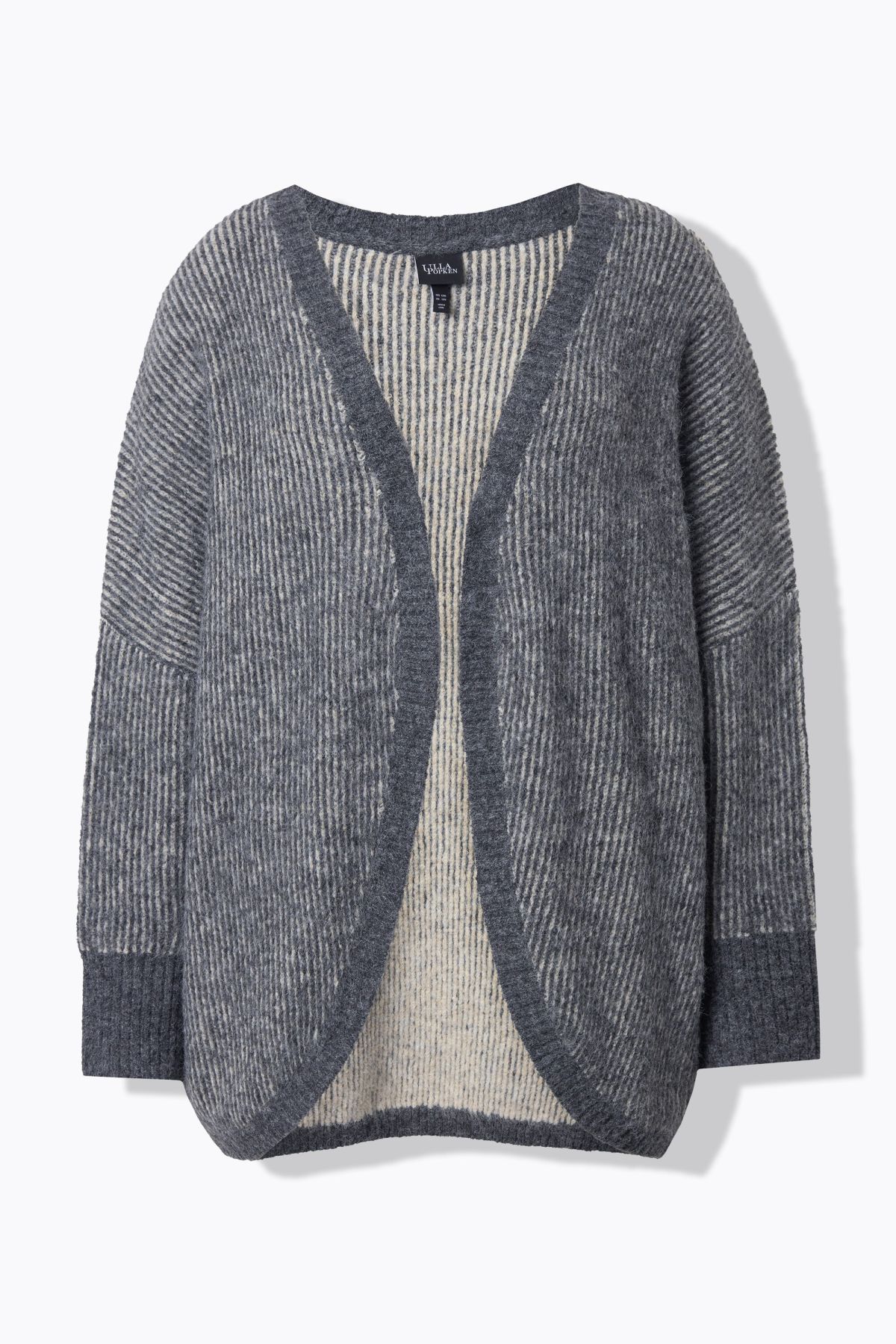 Strickjacke, modischer Egg-Shape (O-Silhouette), aus zweifarbigem Strick mit Wollanteil. Lässige, offene Form mit überschnittenen Schultern, weitem Langarm und Rippbündchen. Hergestellt mit recyceltem Polyester.