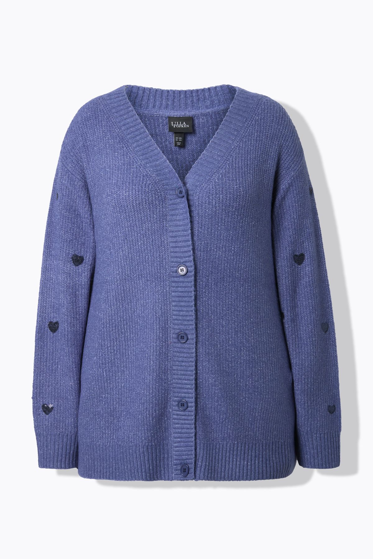 Strickjacke, Relaxed Fit, aus weichem Rippstrick mit Pailletten-Herzen auf dem Langarm. V-Ausschnitt, überschnittene Schultern, Rippbündchen.
