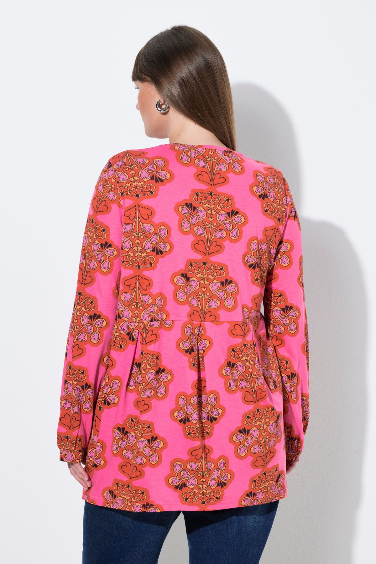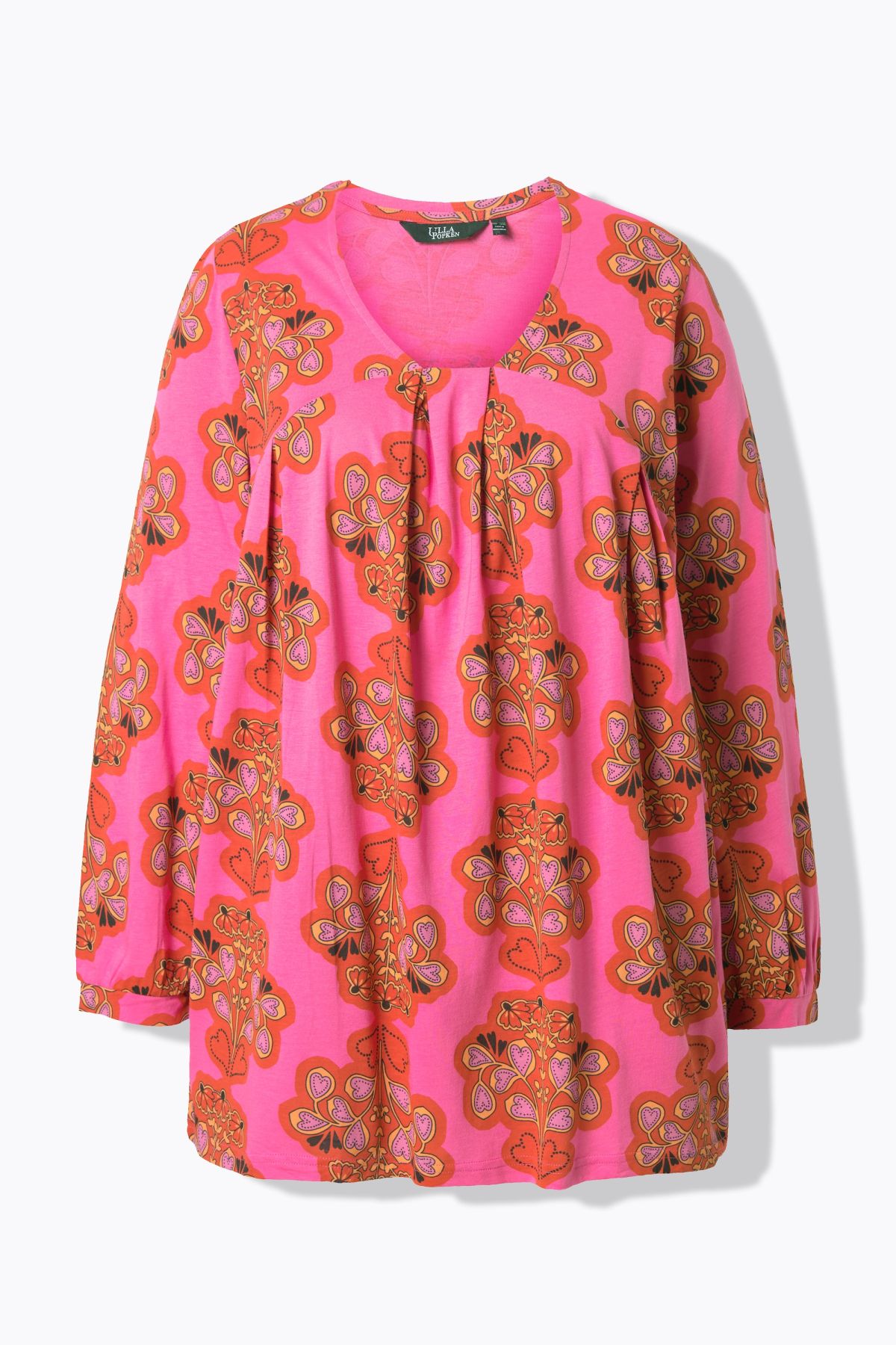 modischer Druck, Carré-Ausschnitt, gebogene Quernaht mit Godetfalten, Langarm mit elastischem Bündchen, extraweiche Baumwoll-Modalmischung, Größenangepasste Länge ca. 80-76 cm.