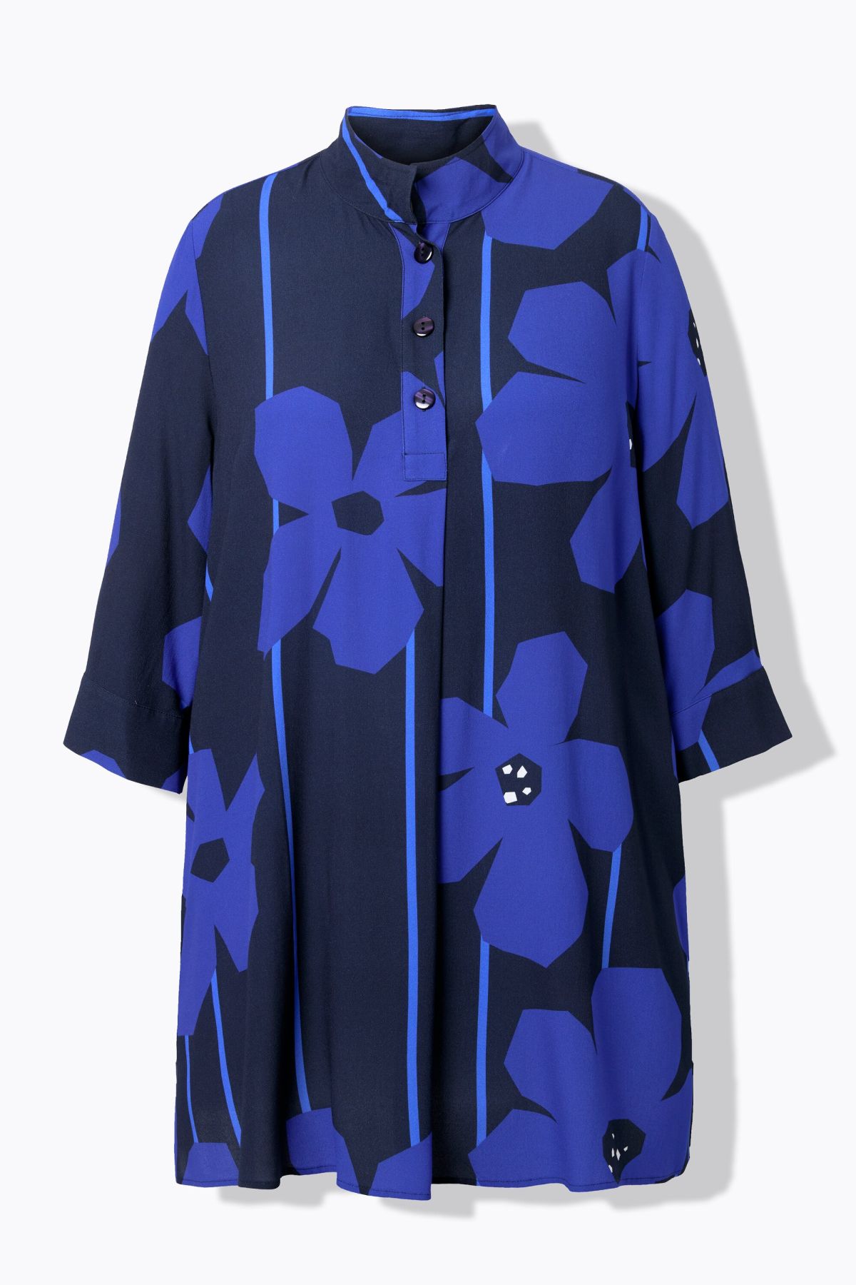großes, modernes Blumenmuster, Stehkragen, Zierfalte unter der halben Knopfleiste, etwas längere A-Linie mit bequemer Saumweite, Seitenschlitze für noch mehr Tragekomfort, weich fließende Viskose, Länge ca. 90 cm.