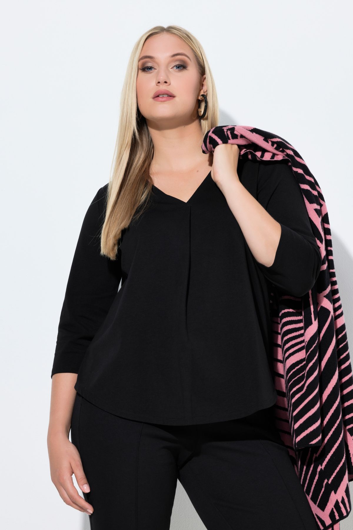 Shirt, A-Linie mit bequemer Saumweite. Zierfalte unter dem V-Ausschnitt, 3/4-Ärmel, gerundeter Saum.