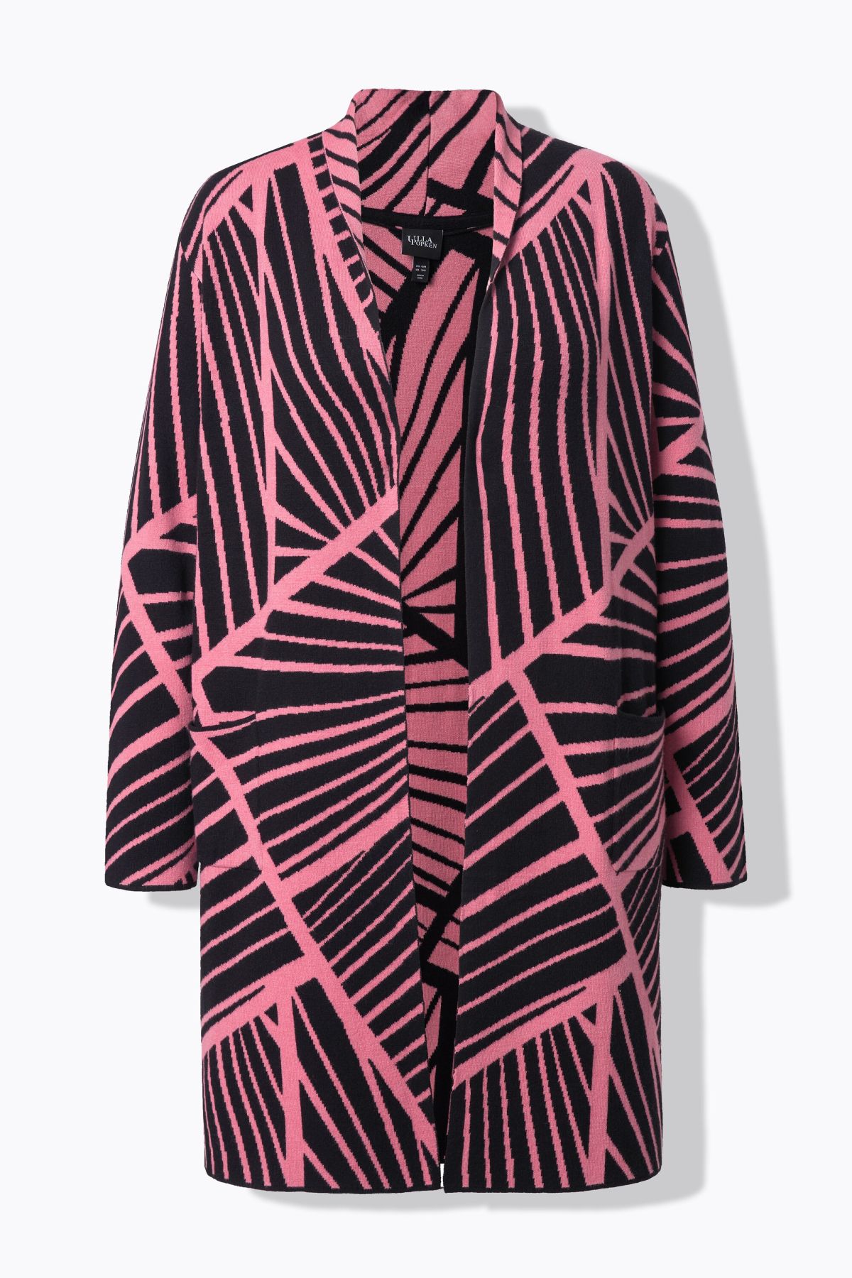 modernes, grafisches Muster, Schalkragen, längere, offene Passform ohne Verschluss, zwei aufgesetzte Taschen, weicher Jacquard-Strick, Länge ca. 92 cm.