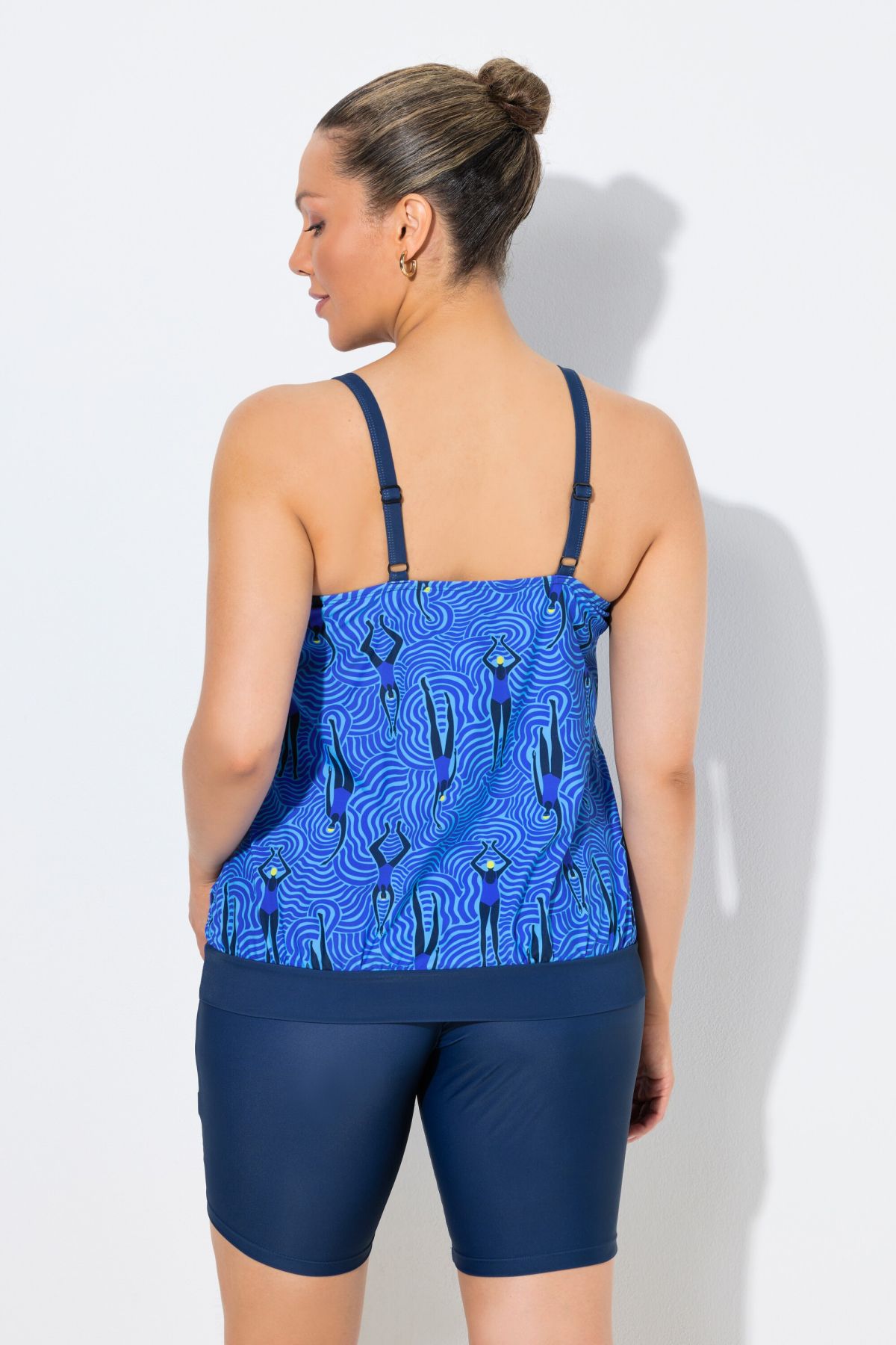 Tankini, Zweiteiler, mit Softschalen und sportivem Schwimmerinnen-Muster. Einfarbig abgesetzt: Ausschnitt, verstellbare Träger und Saum. Längeres Oberteil mit Unterbrustband. Passender Slip. OEKO-TEX.