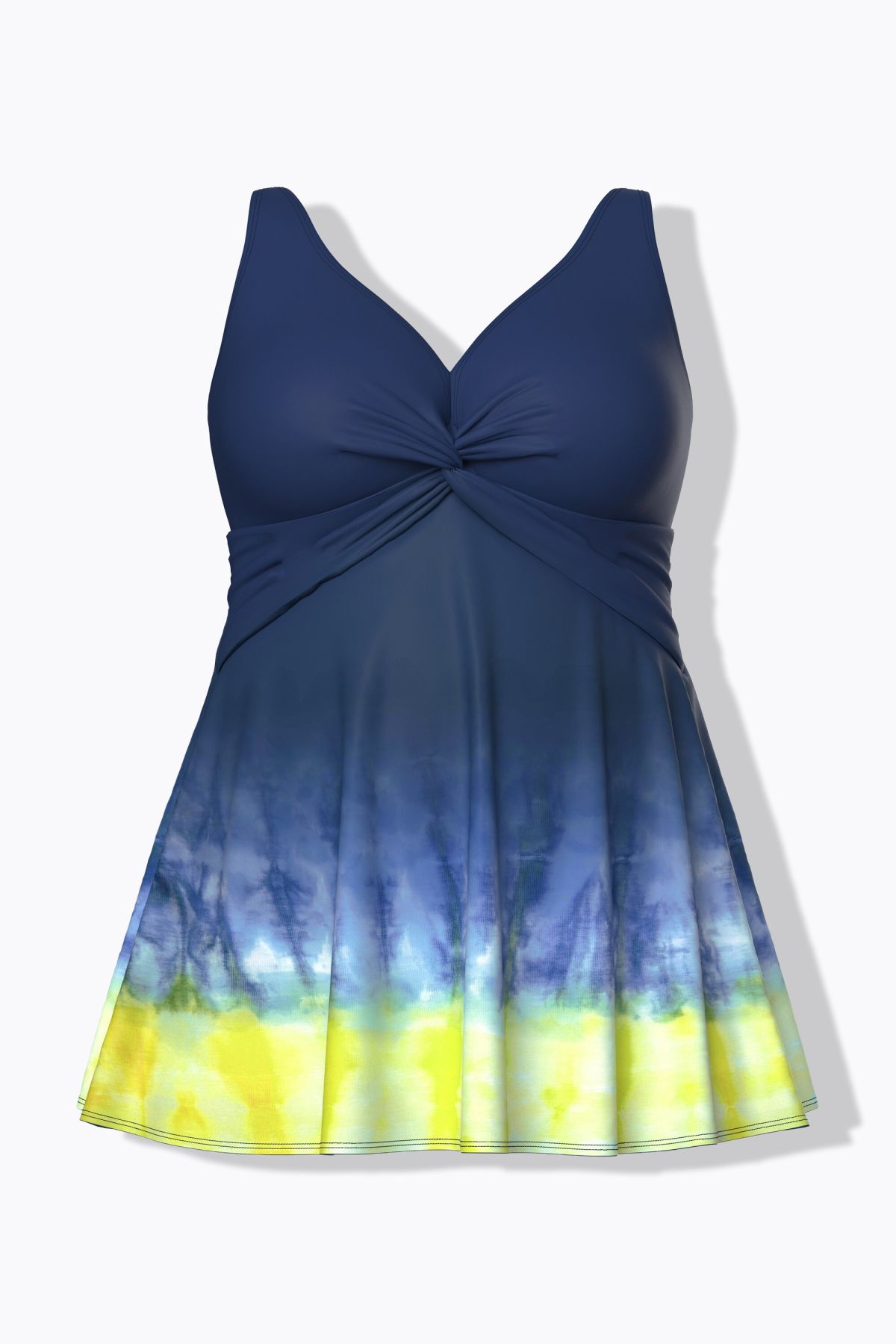 Badekleid mit Softschalen und Batikdruck. Unsichtbar eingearbeiteter Badeanzug. Feminine Raffung unter der Büste, stützendes Unterbrustband, straffendes Vorderfutter. Hergestellt mit recyceltem Polyamid. OEKO-TEX.