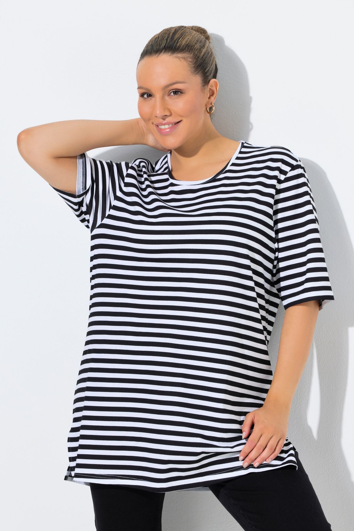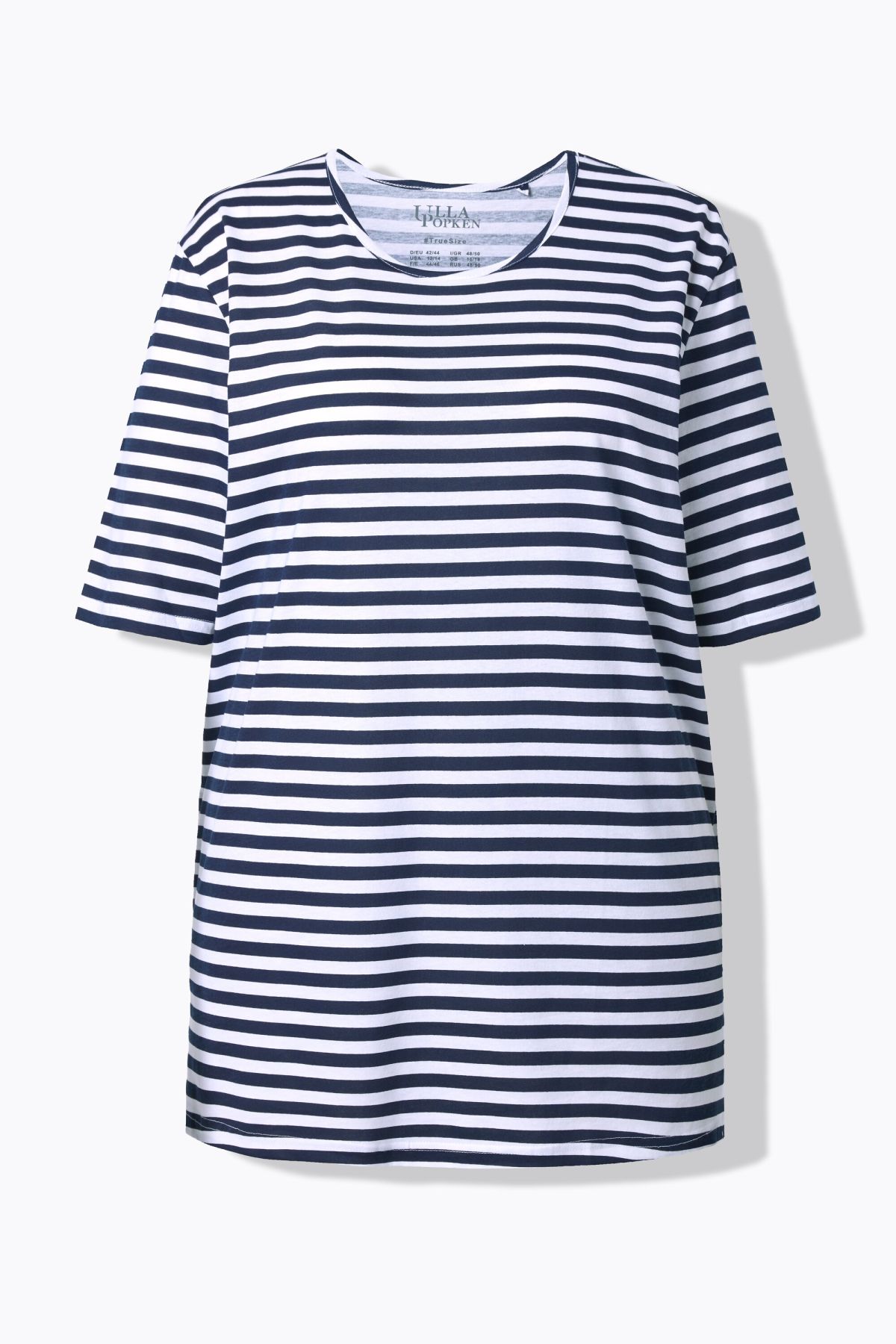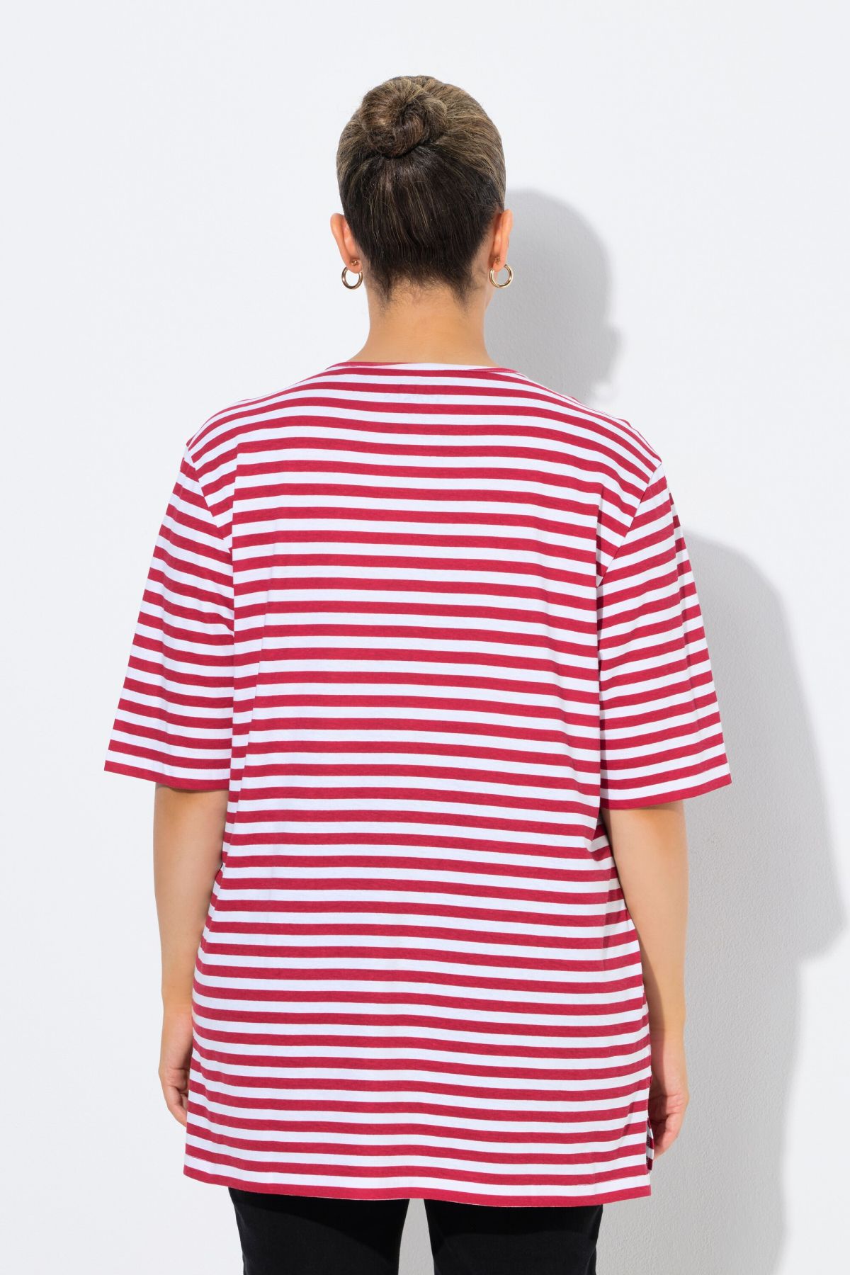 weicher Baumwolljersey mit Ringelmuster, Rundhalsausschnitt, Passform Relaxed mit Seitenschlitzen, Halbarm, OEKO-TEX Made in Green, Größenangepasste Länge ca. 78-82 cm.