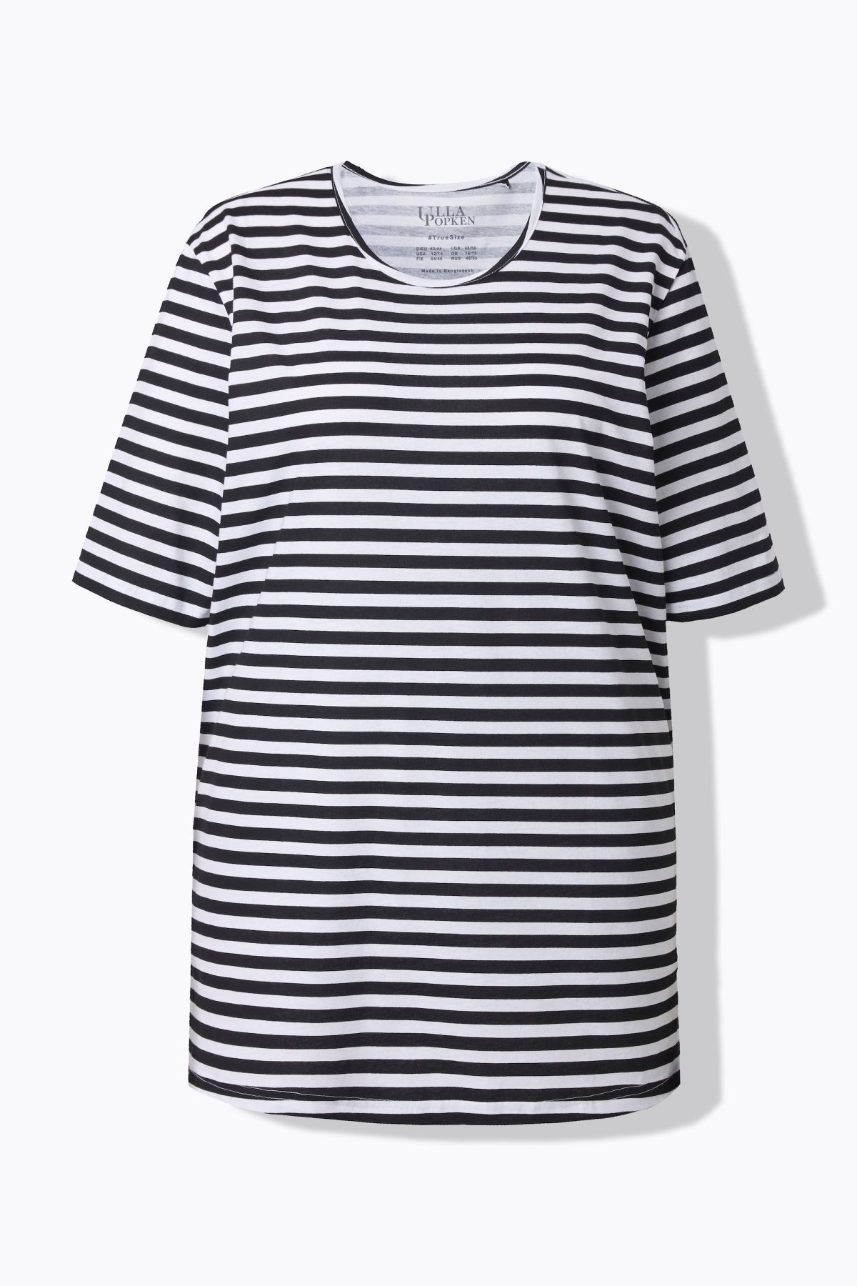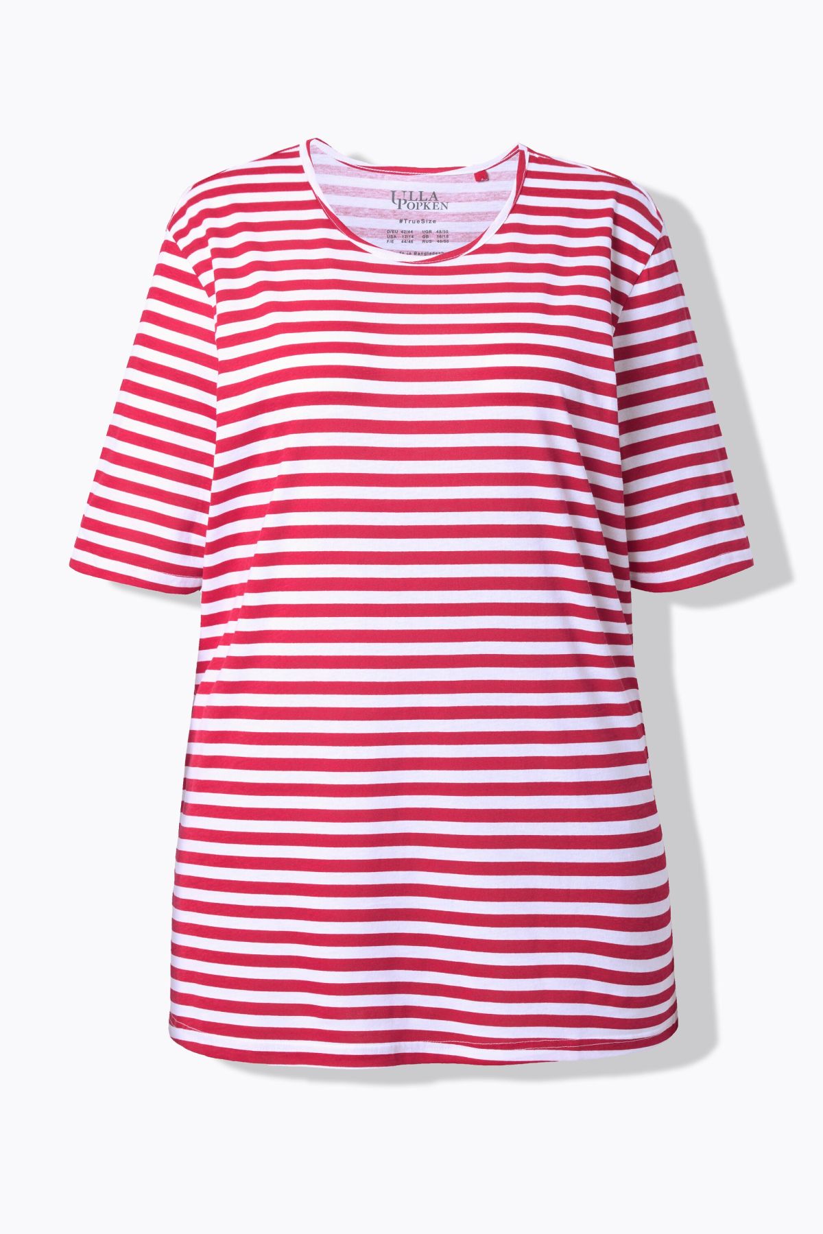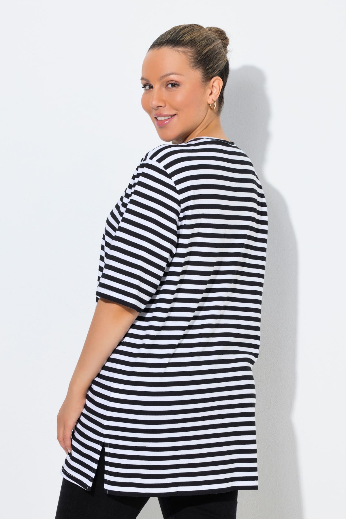 weicher Baumwolljersey mit Ringelmuster, Rundhalsausschnitt, Passform Relaxed mit Seitenschlitzen, Halbarm, OEKO-TEX Made in Green, Größenangepasste Länge ca. 78-82 cm.