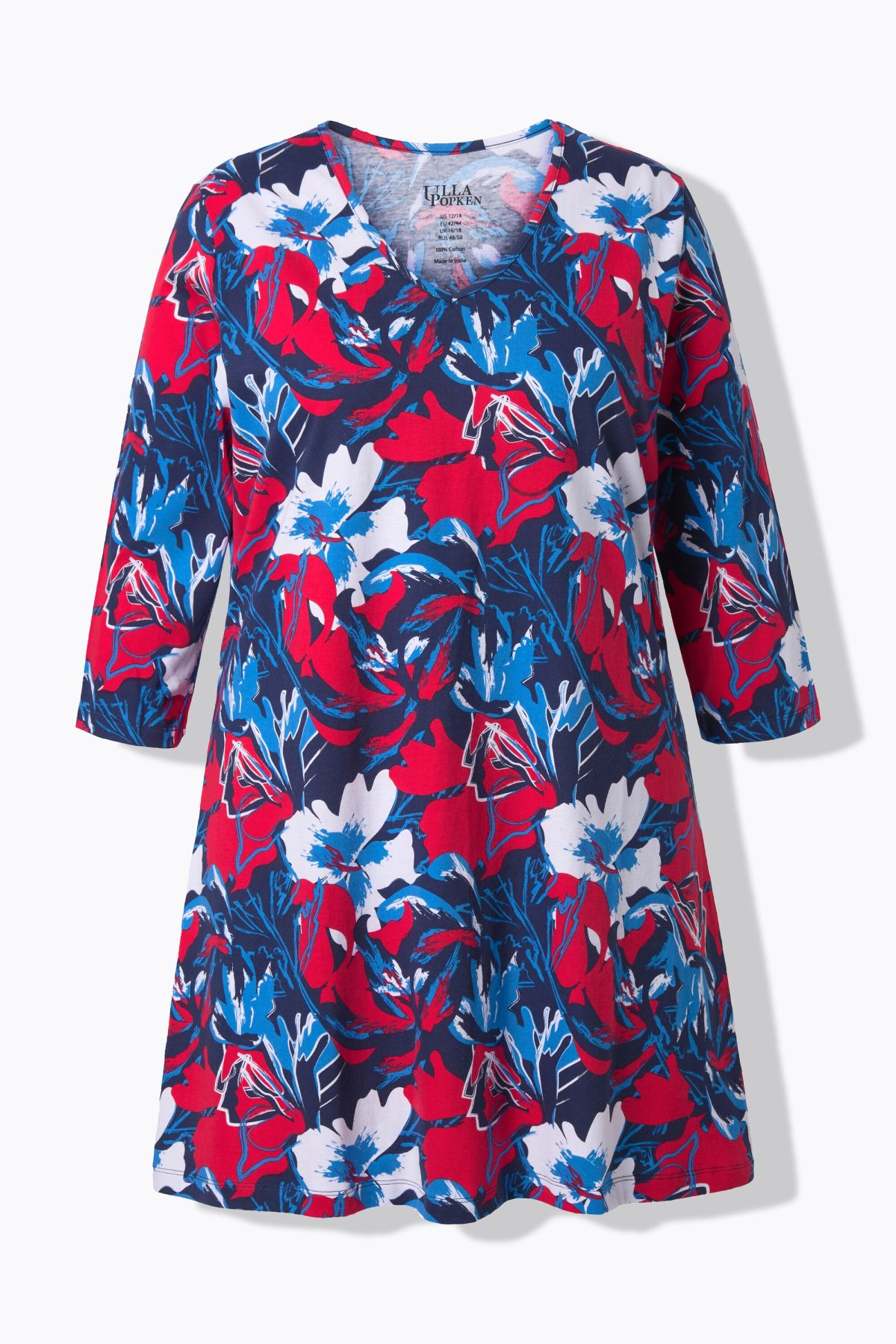 Longshirt, A-Linie, mit Blumenmuster. V-Ausschnitt, 3/4-Ärmel. Bequem weiter Saum.
